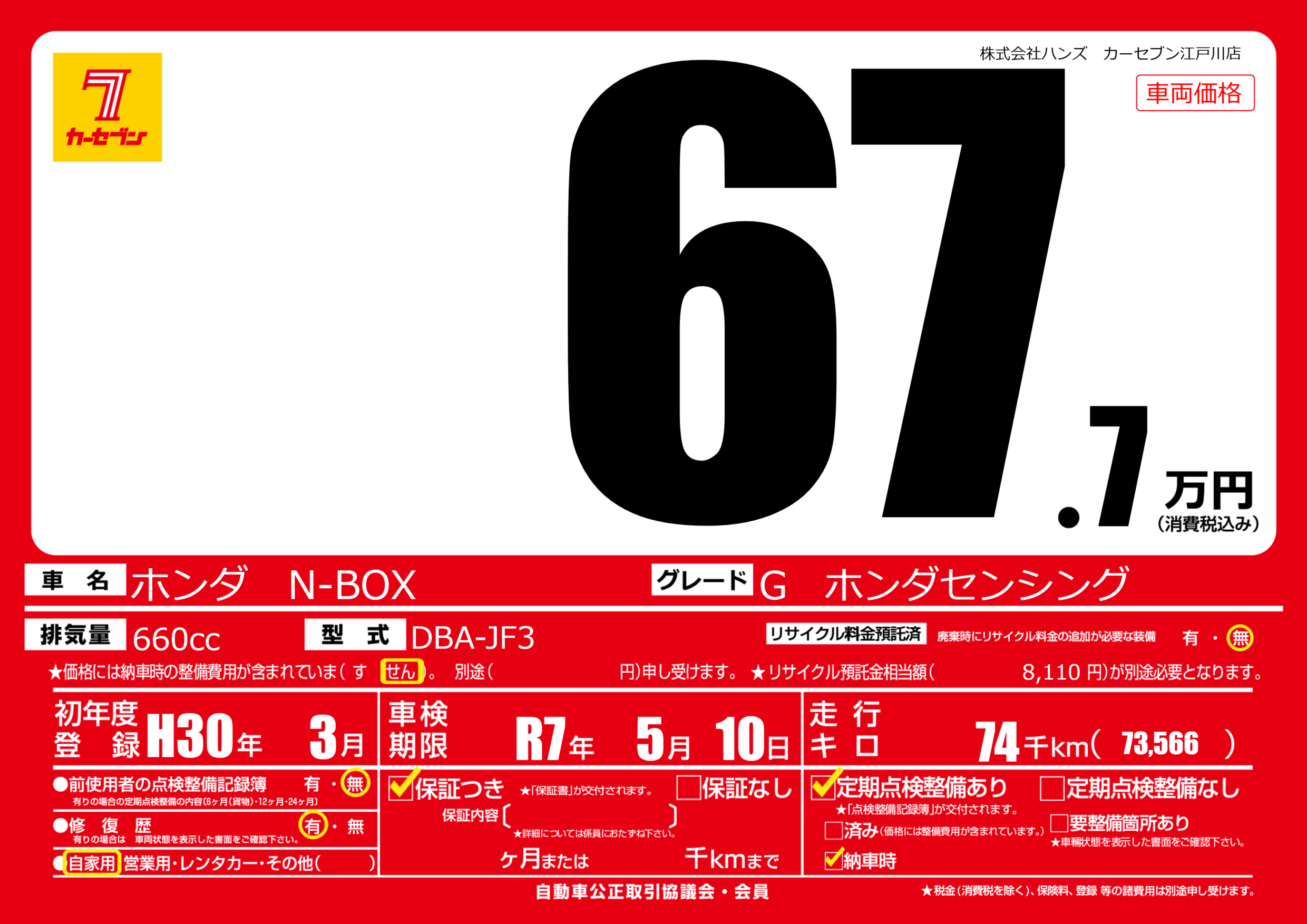 | 走行キロ | 7.4万km | 初年度登録 | H30年3月 |