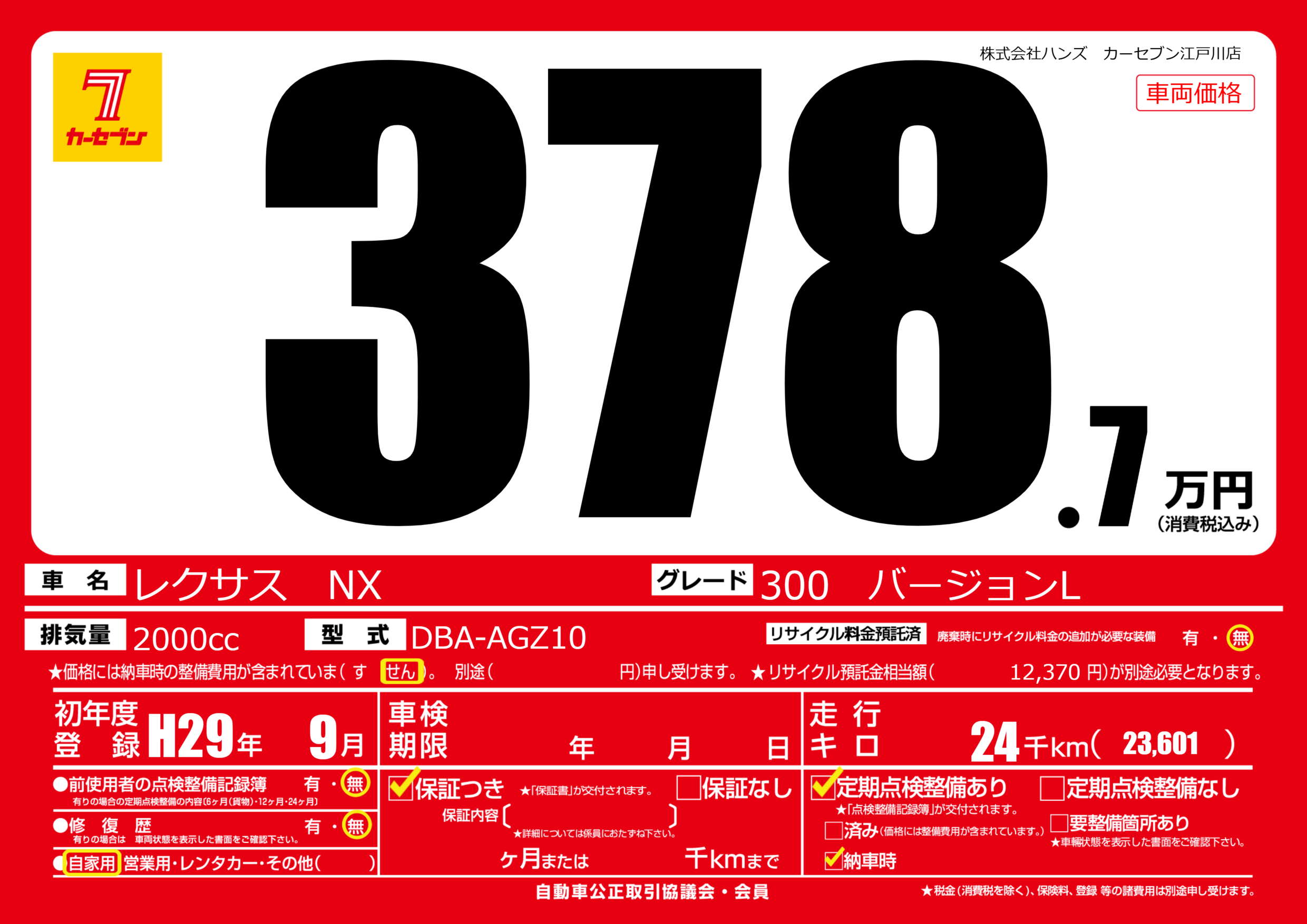 | 車名 | レクサス NX | グレード ミッション 排気量 |