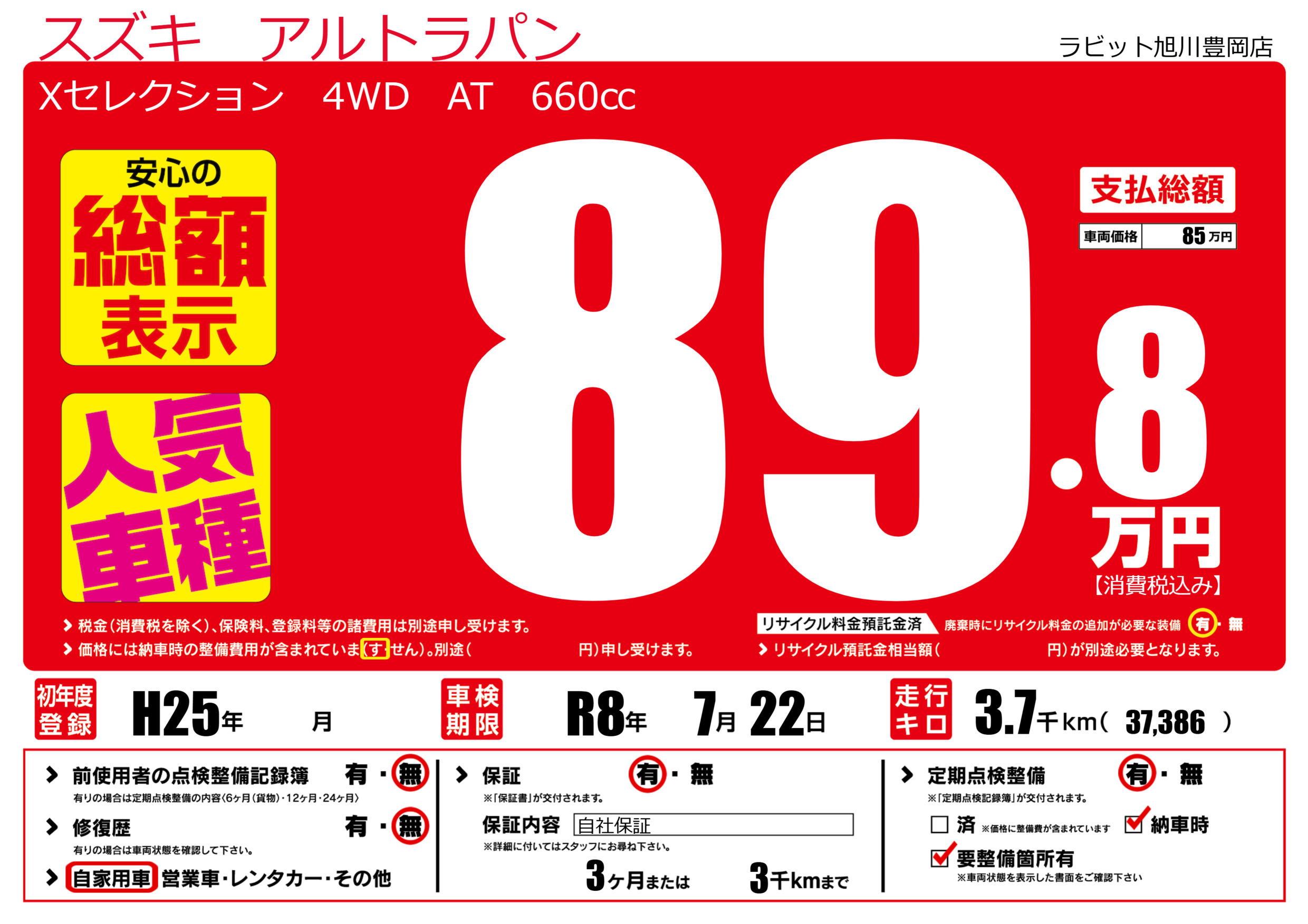 | 走行キロ | 0.3万km | 初年度登録 | H25年---月 |