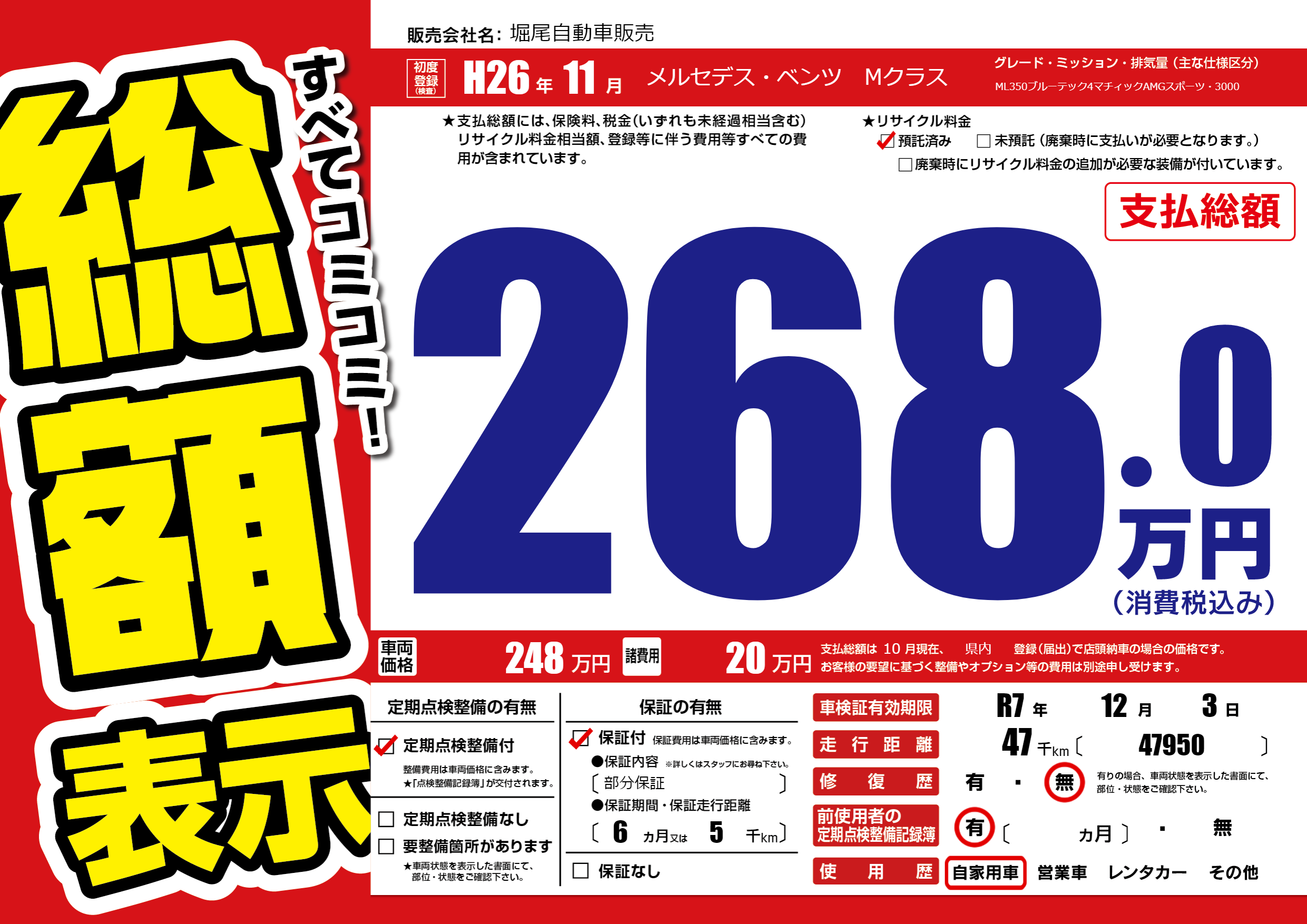 | 車名 | メルセデス・ベンツ Mクラス | グレード ミッション 排気量 |