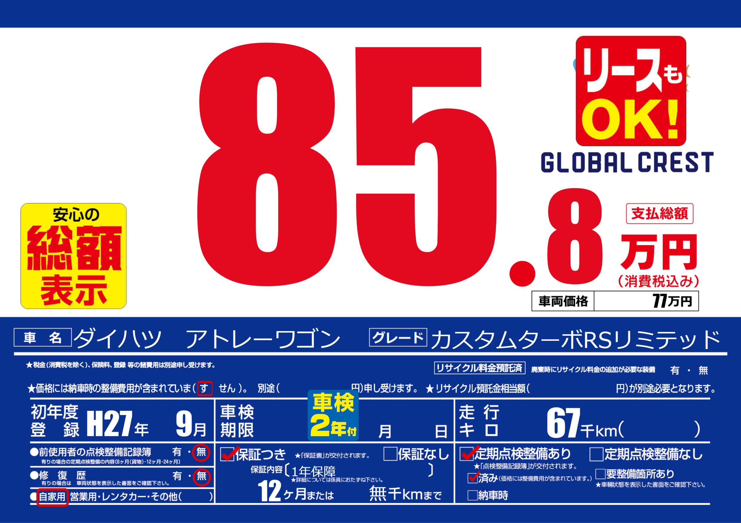 | 定期点検整備 | 定期点検整備あり 定期点検整備済み | ||