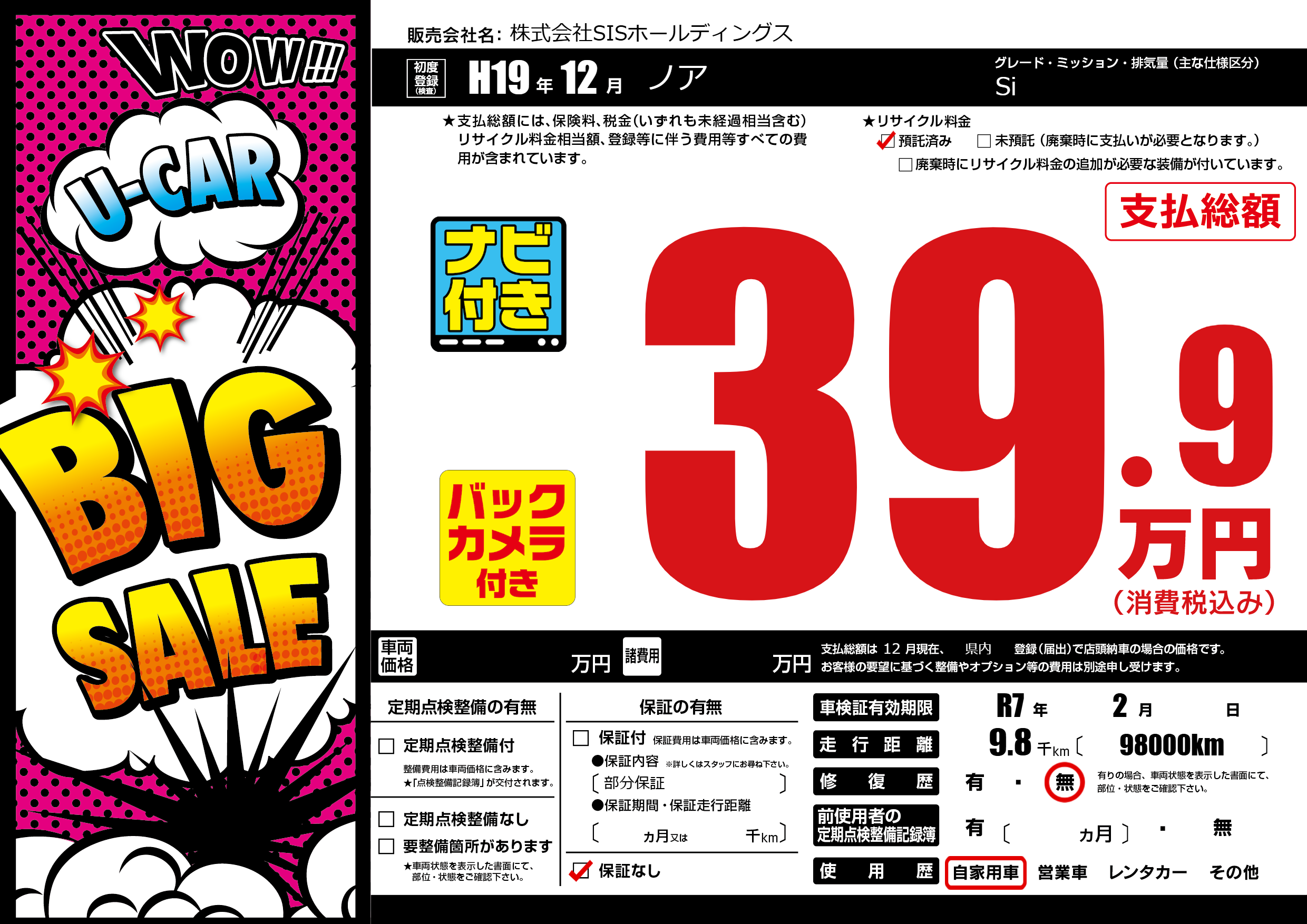 | 走行キロ | 0.9万km | 初年度登録 | H19年12月 |