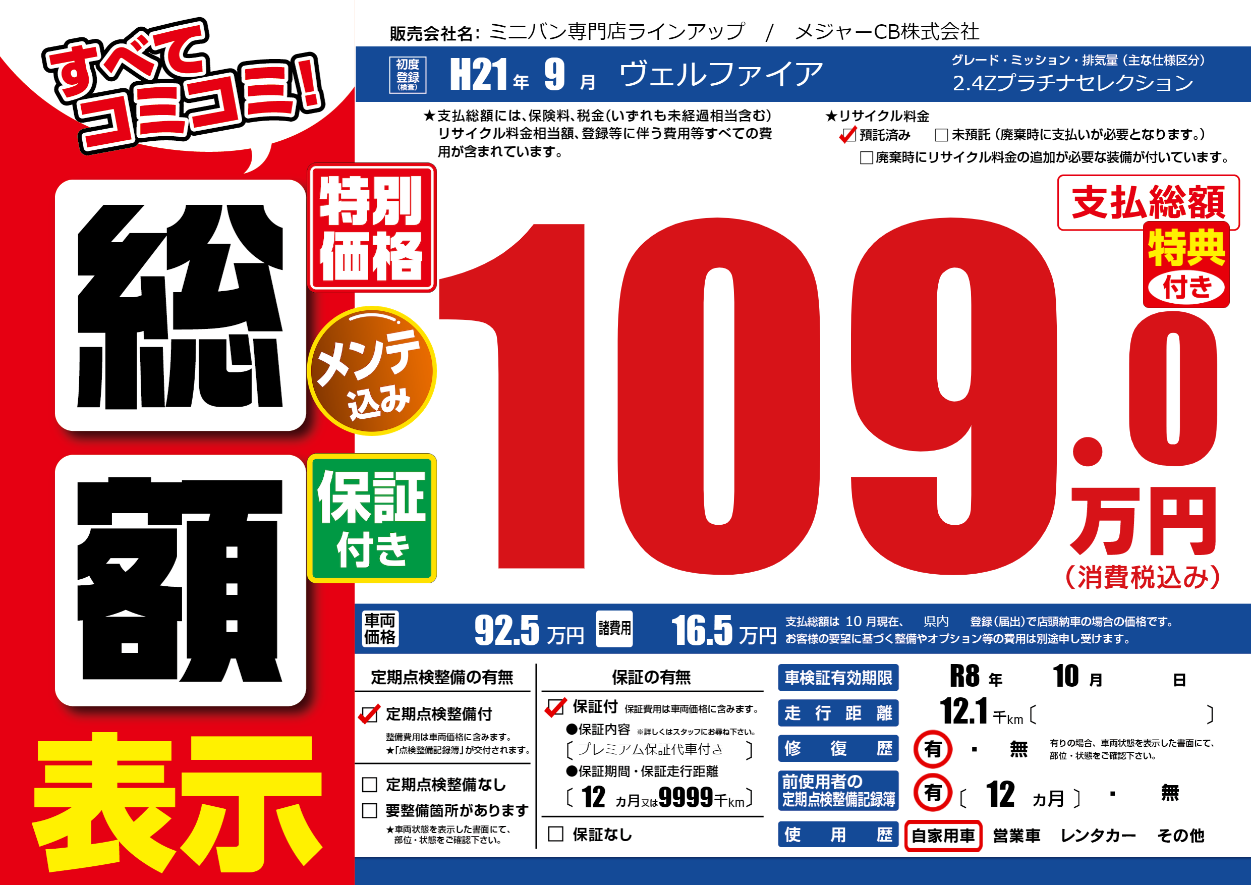 保証付き 保証内容(プレミアム保証代車付き) 12ヶ月または(9999)千kmまで |
