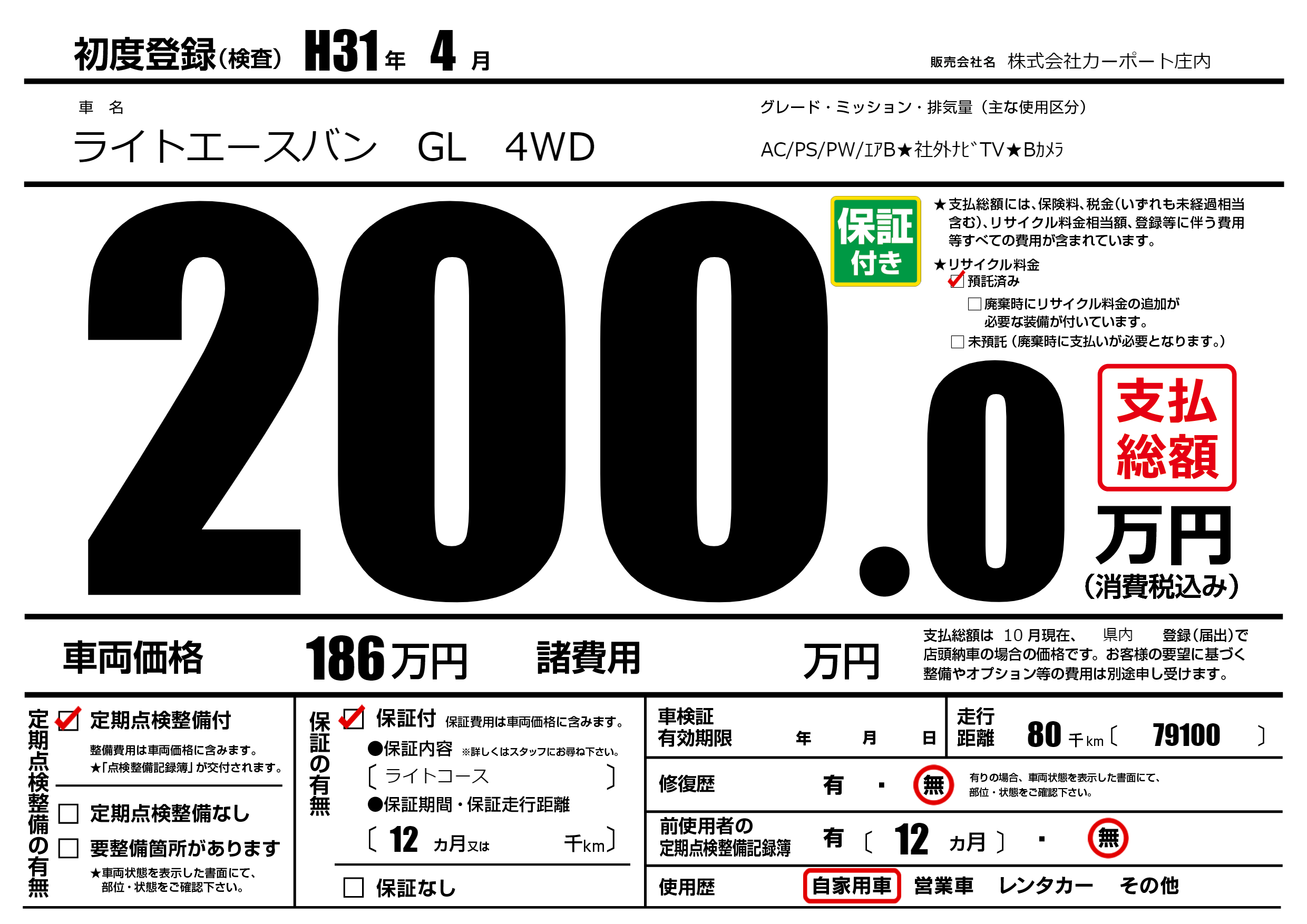 | 走行キロ | 8万km | 初年度登録 | H31年4月 |