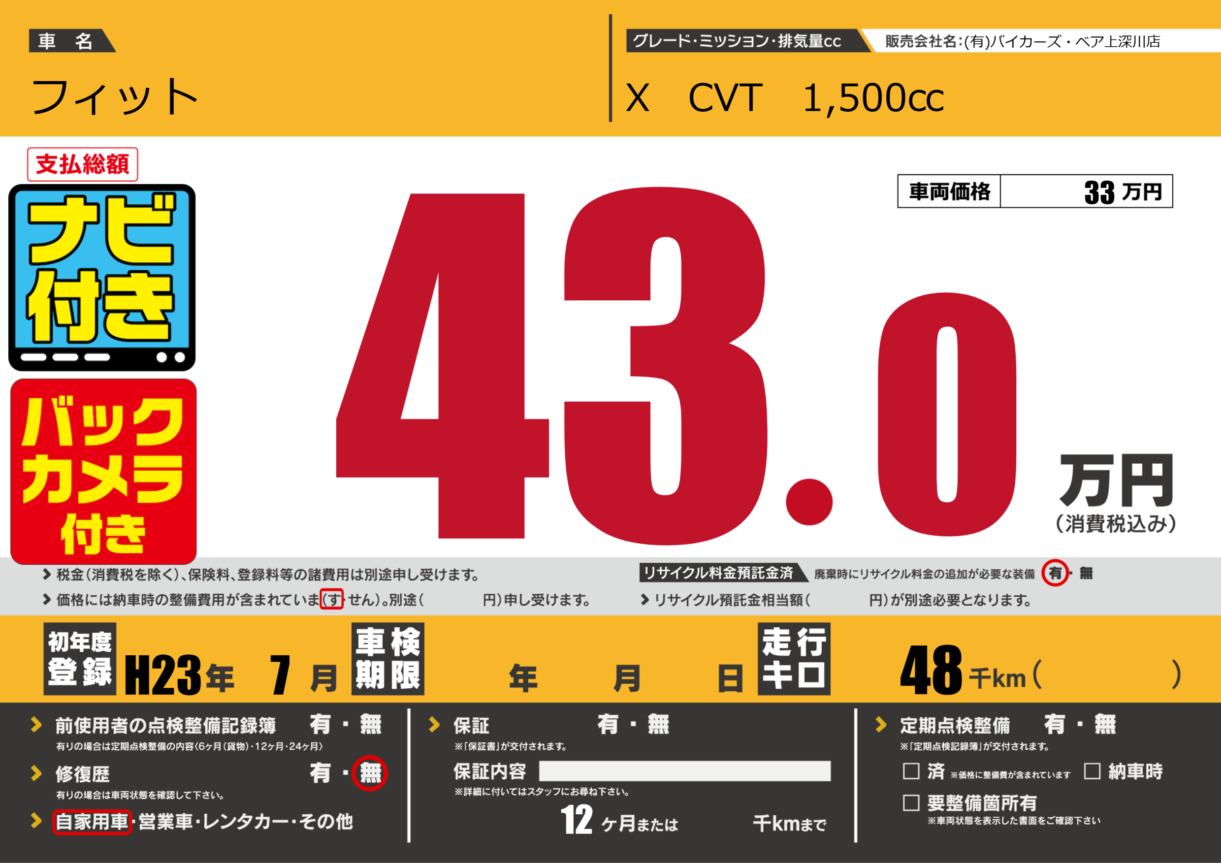 | 走行キロ | 4.8万km | 初年度登録 | H23年7月 |