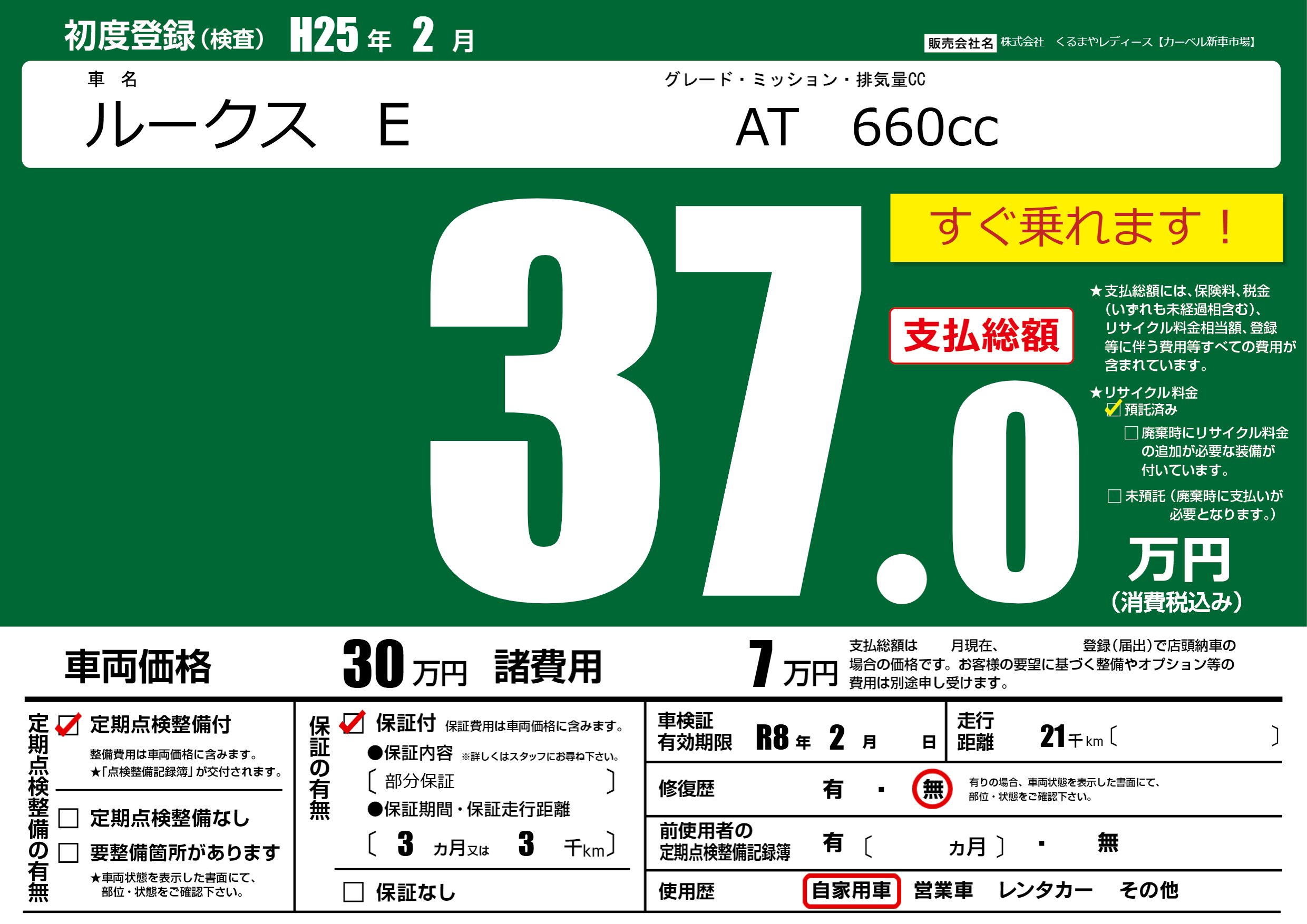 | 走行キロ | 2.1万km | 初年度登録 | H25年2月 |
