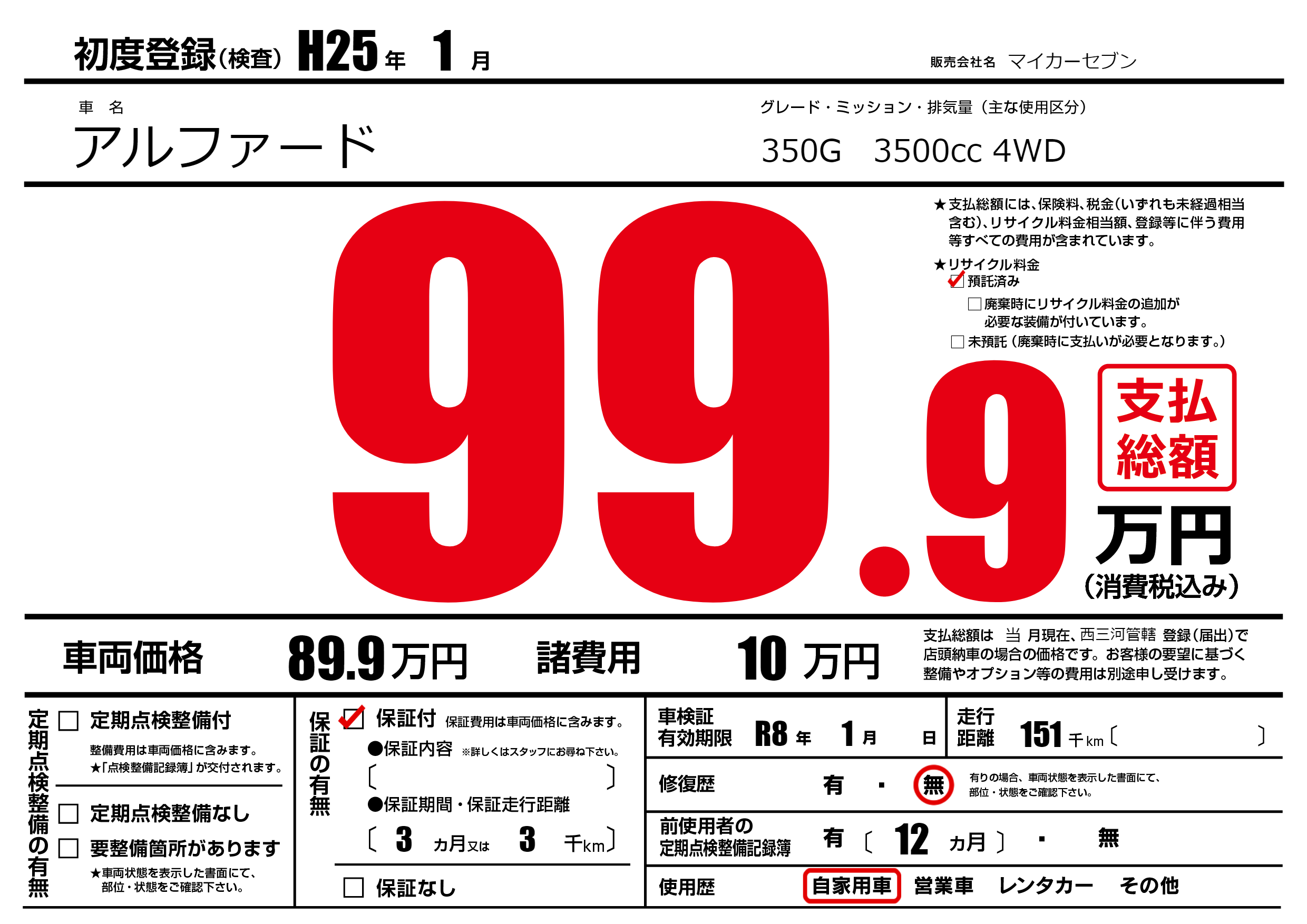 なし | 車検制限 | R8年1月---月 |