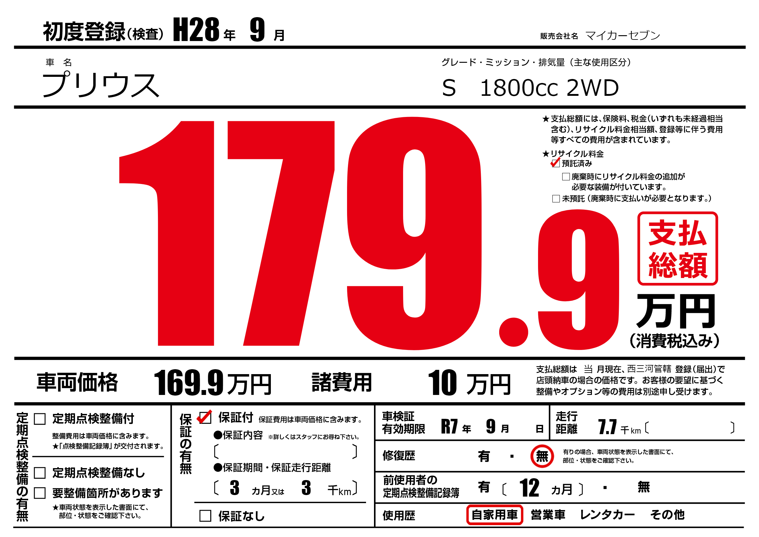 | 車検制限 | R7年 9月 - 日 | ||