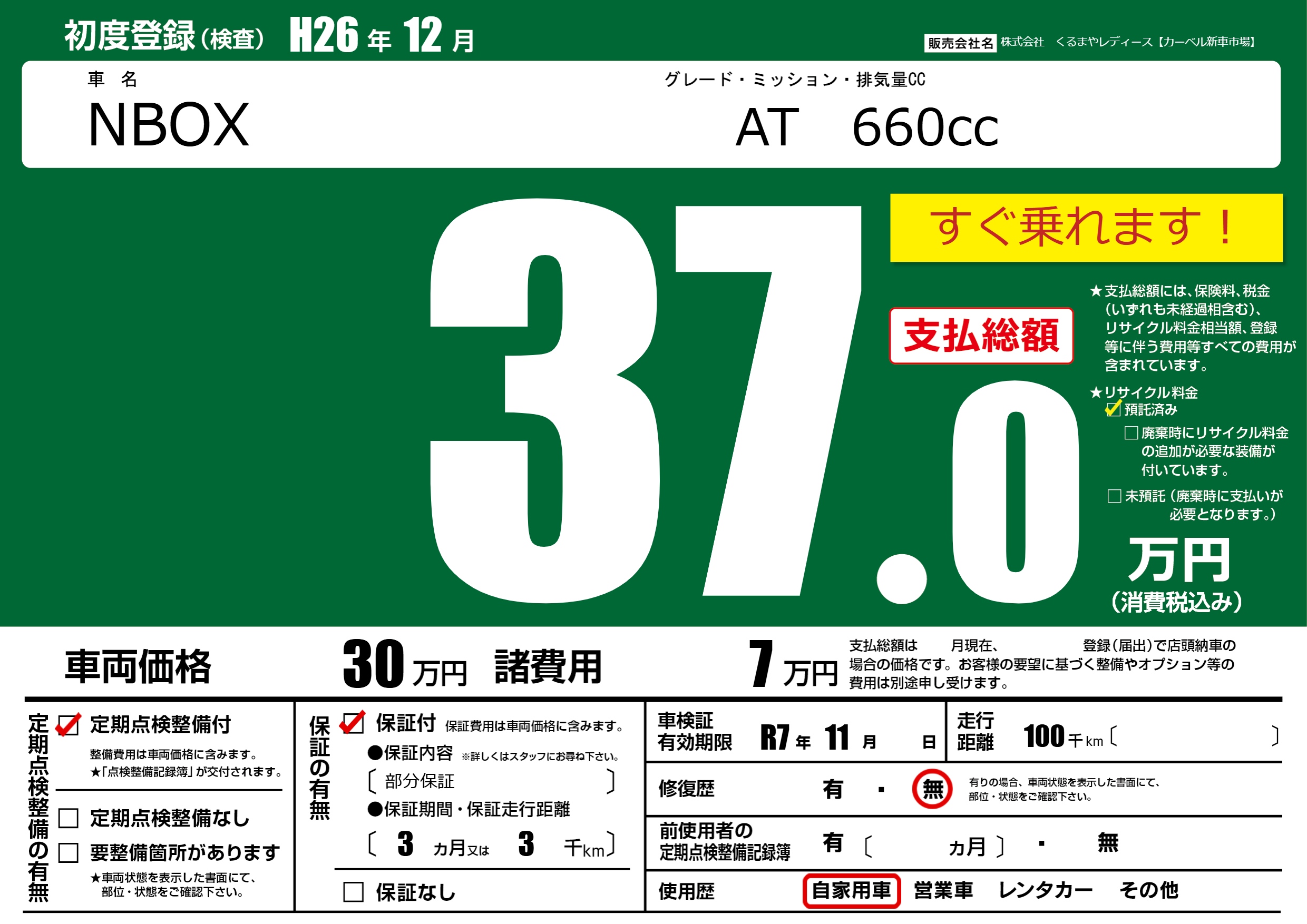 | 走行キロ | 10万km | 初年度登録 | H26年12月 |