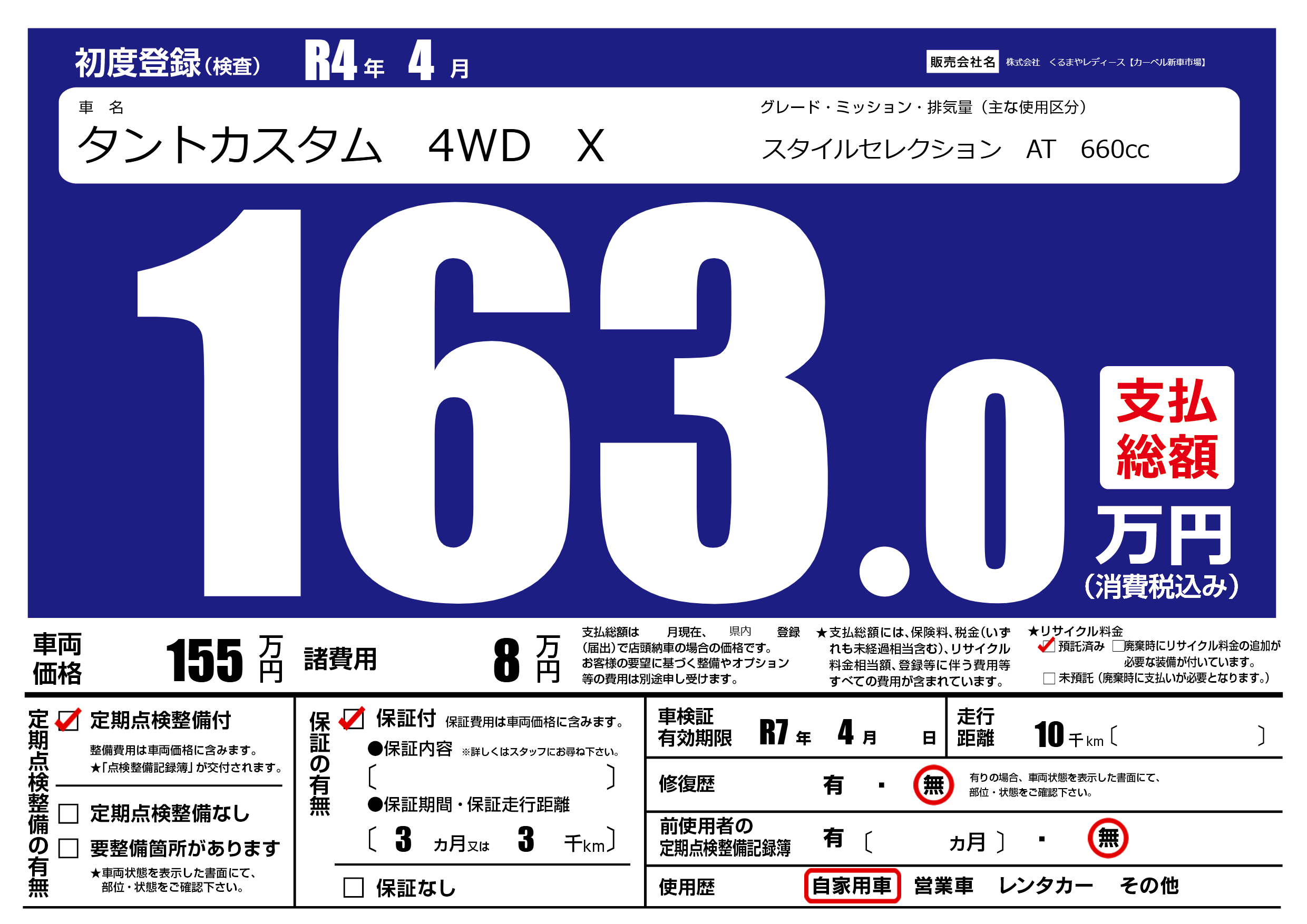 | 車名 | タントカスタム 4WD X | グレード ミッション 排気量 |