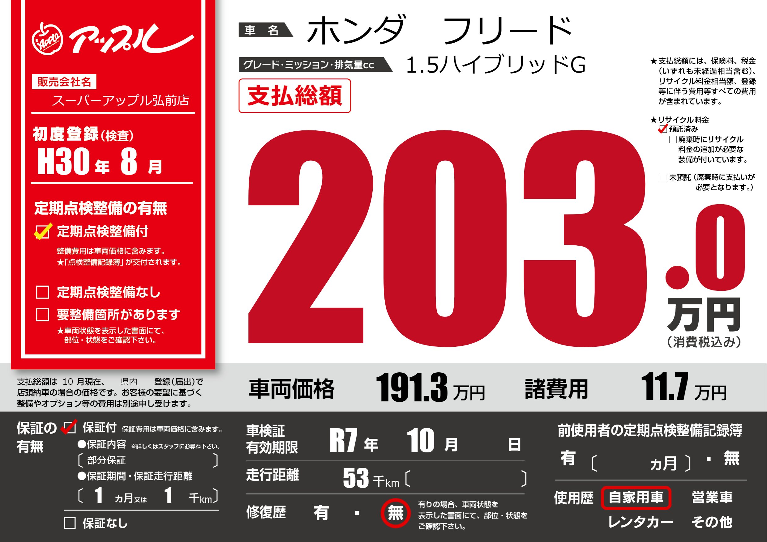 | 車検制限 | R7年 10月 - 日 | ||