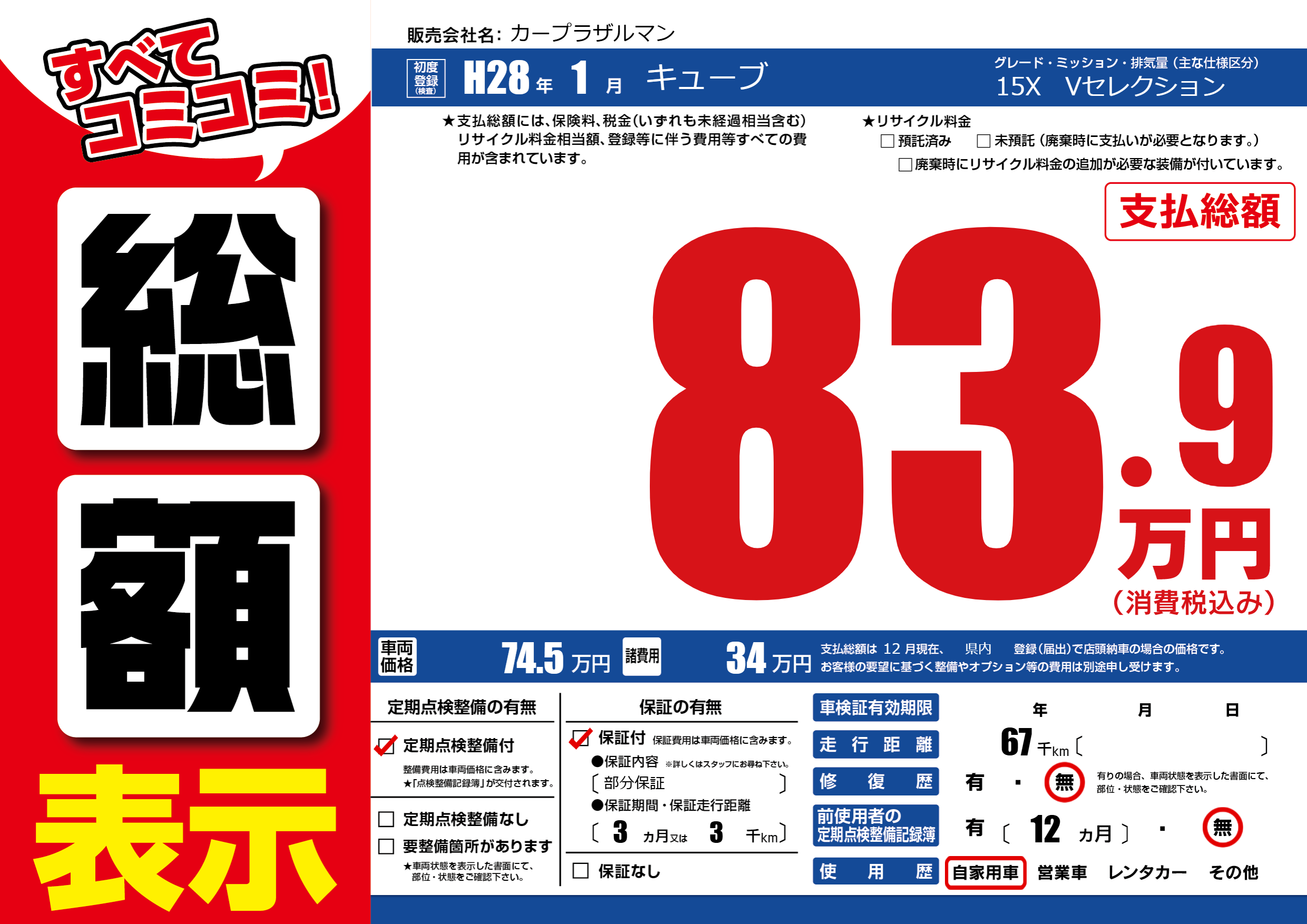 保証付き 保証内容(部分保証) 3ヶ月または(3)千kmまで |
