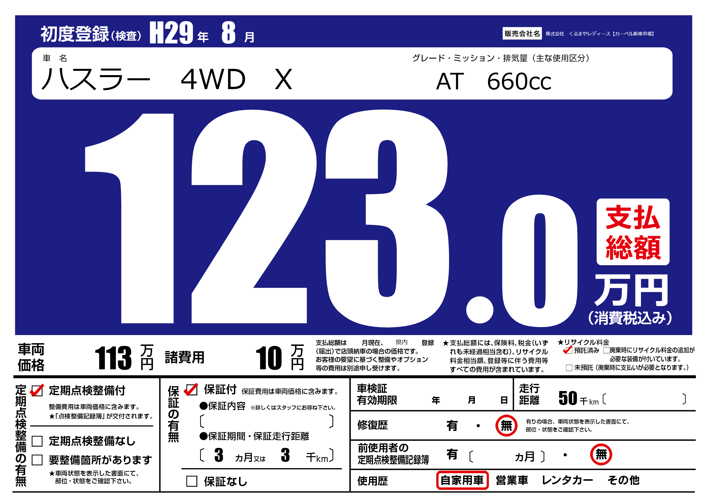 | 車名 | ハスラー 4WD X | グレード ミッション 排気量 |