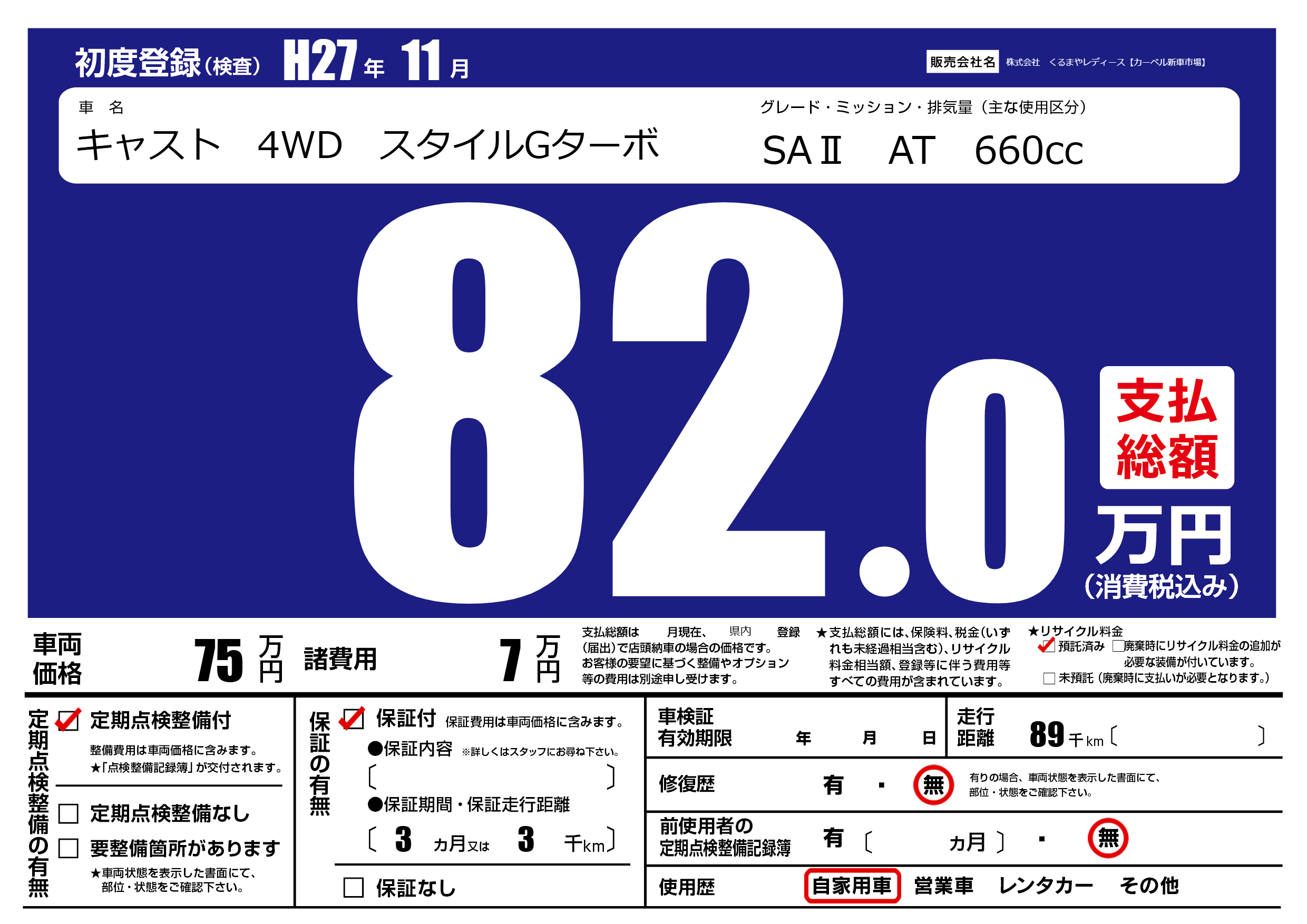 保証付き 保証内容(---) 3ヶ月または(3)千kmまで |