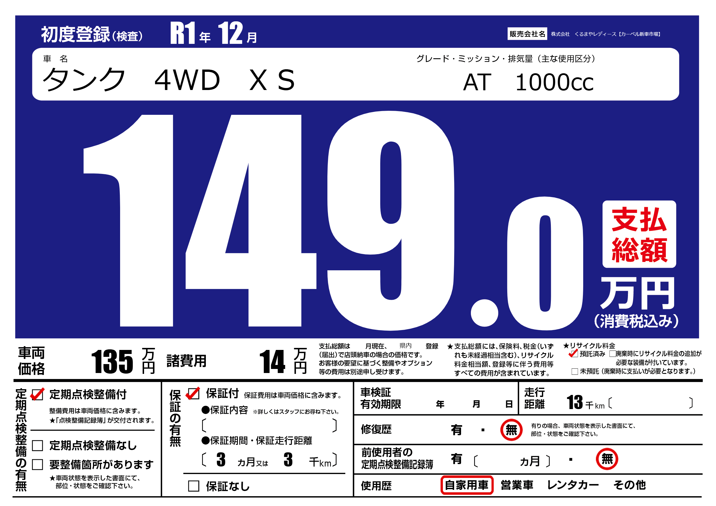 | 車名 | タンク 4WD X S | グレード ミッション 排気量 |