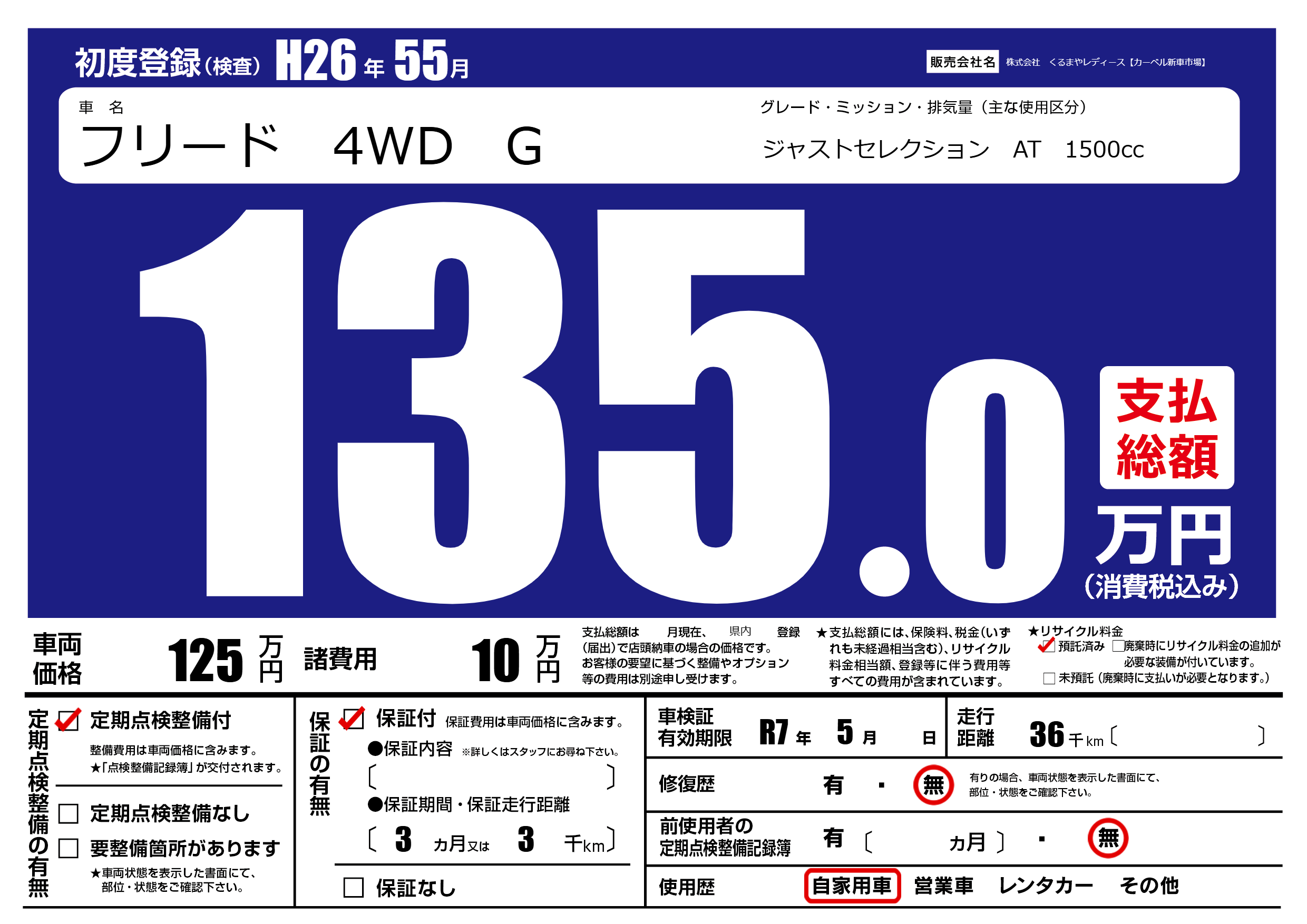 | 走行キロ | 3.6万km | 初年度登録 | H26年55月 |