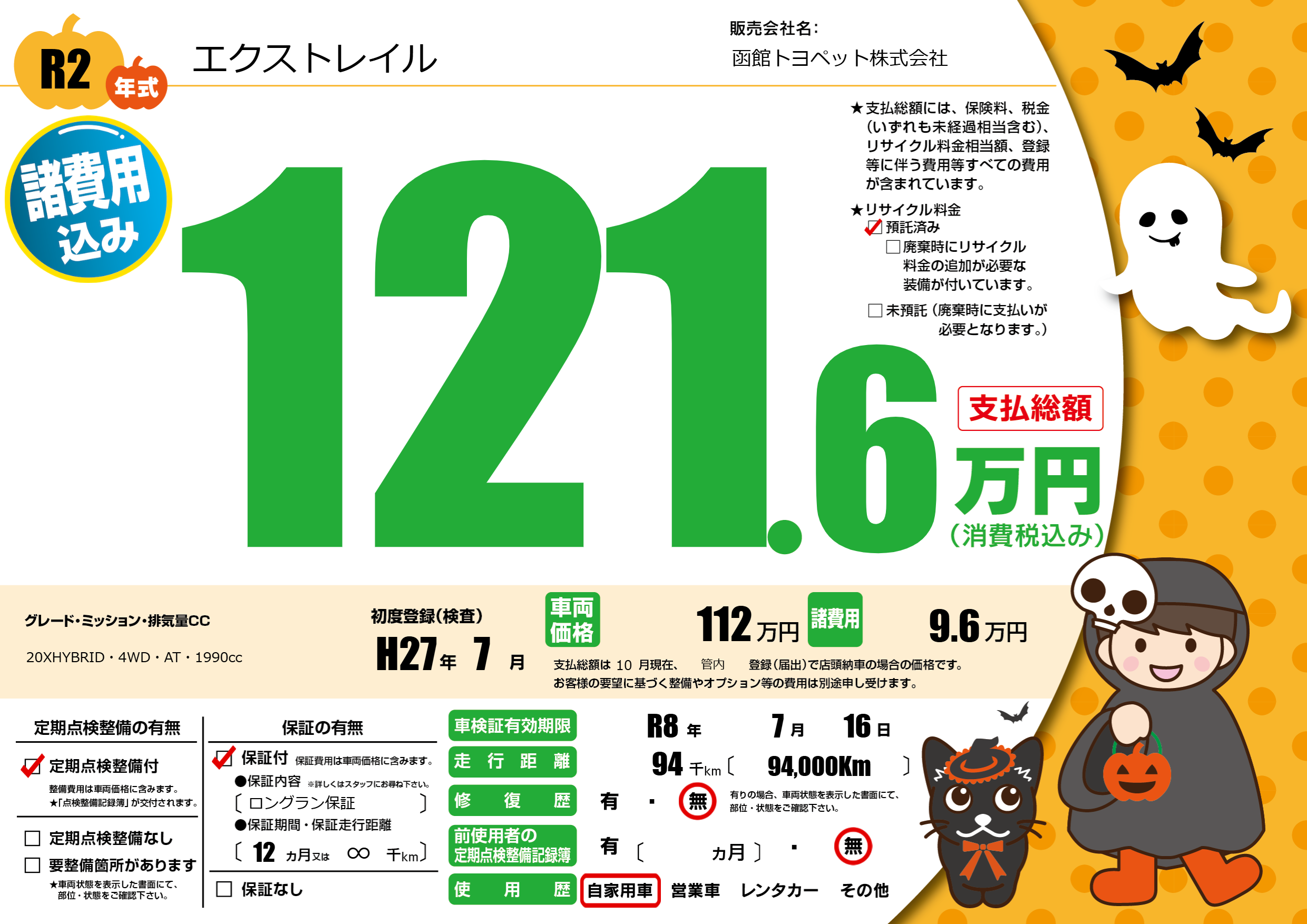 | 走行キロ | 9.4万km | 初年度登録 | H27年7月 |