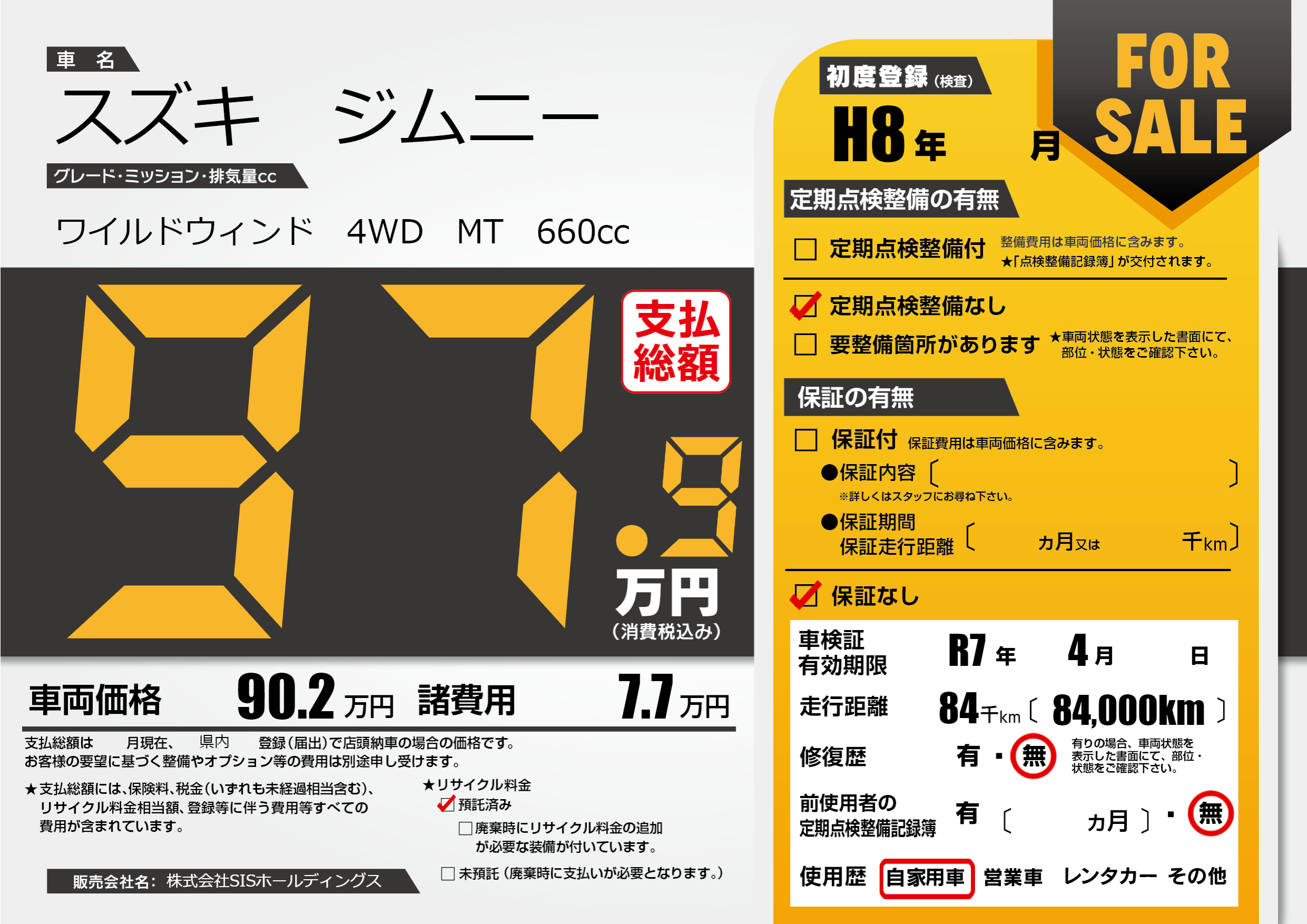 | 走行キロ | 8.4万km | 初年度登録 | H8年---月 |