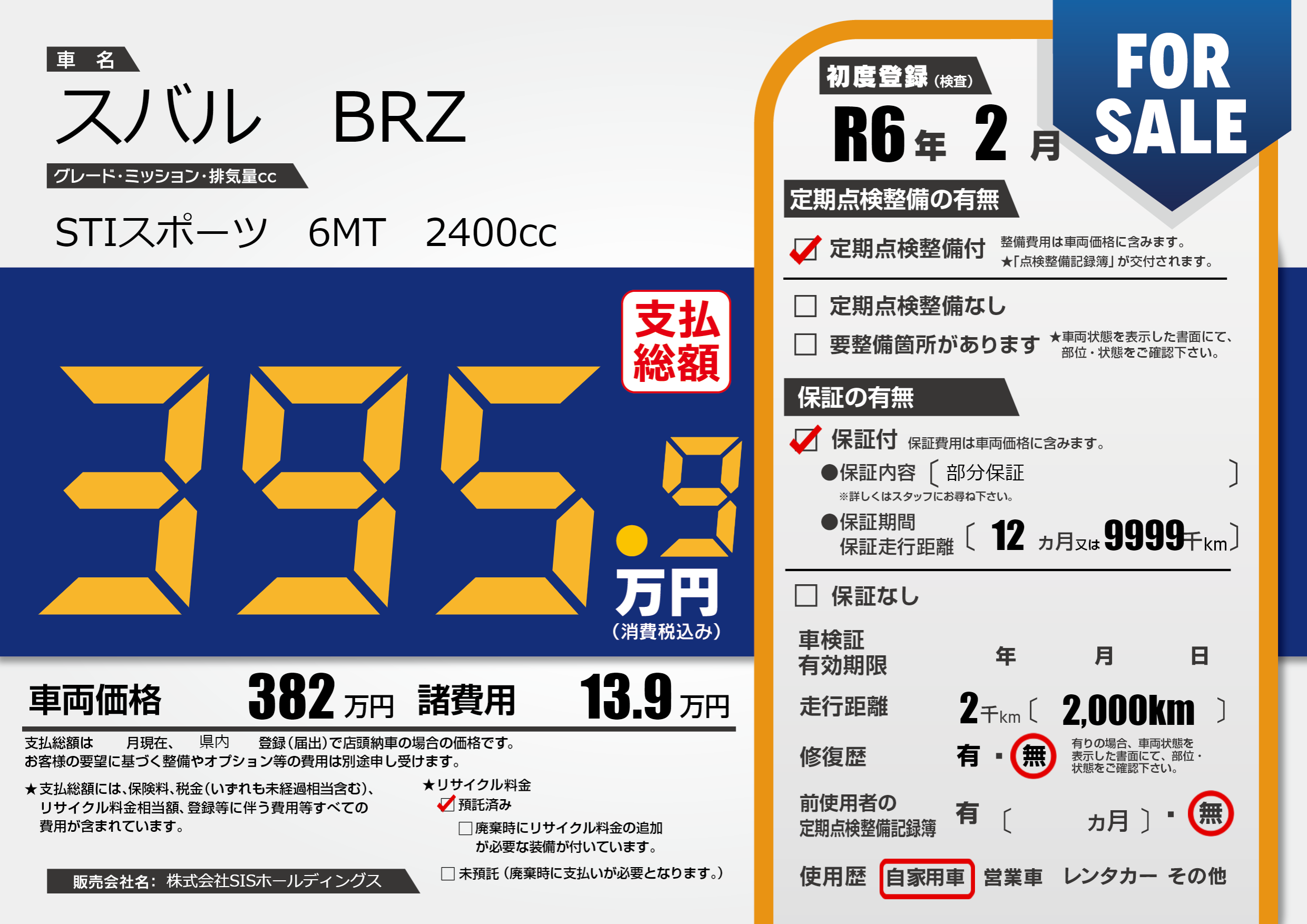 | 車名 | スバル BRZ | グレード ミッション 排気量 |