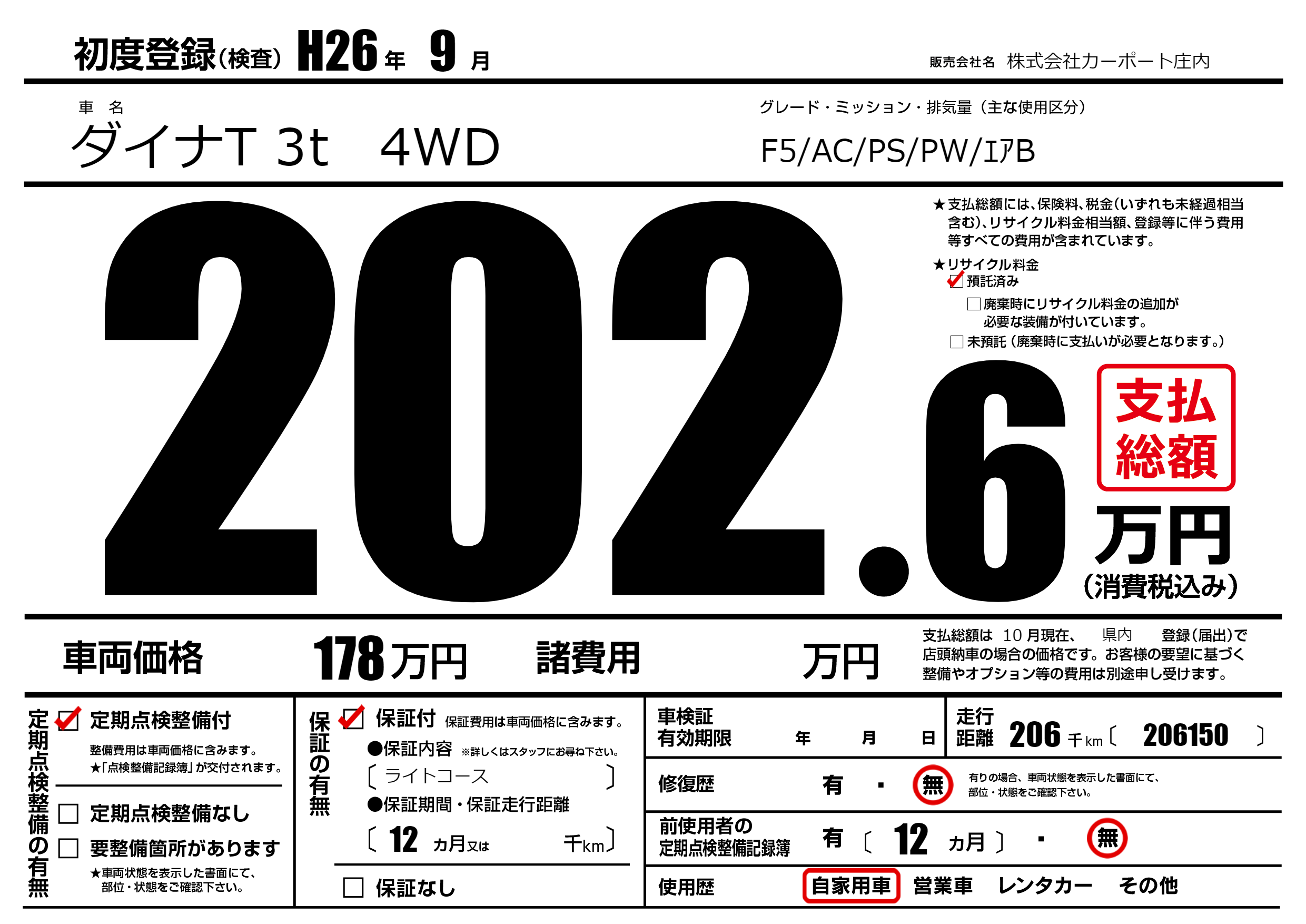 | 走行キロ | 20.6万km | 初年度登録 | H26年9月 |