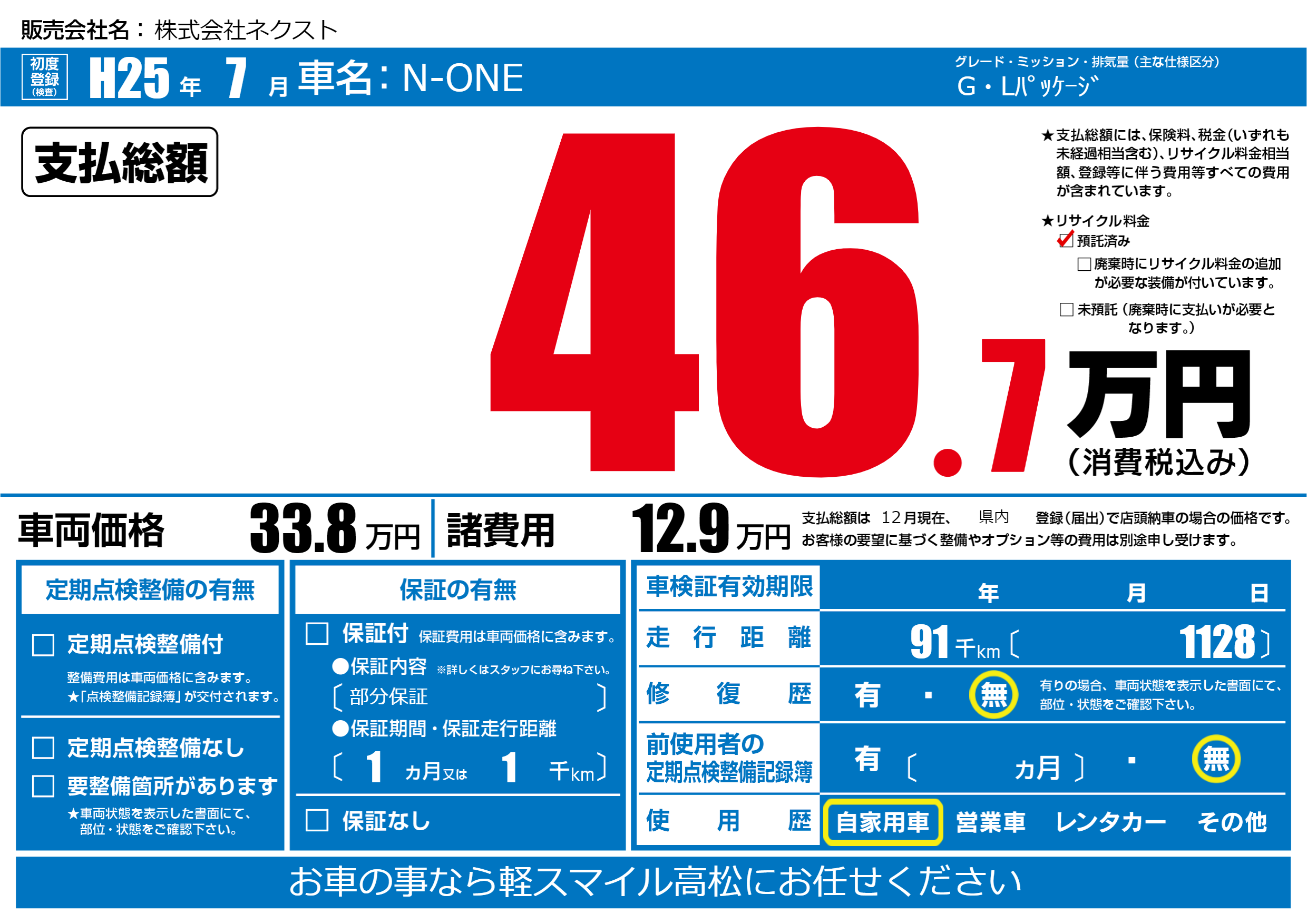 | 車名 | N-ONE | グレード ミッション 排気量 |