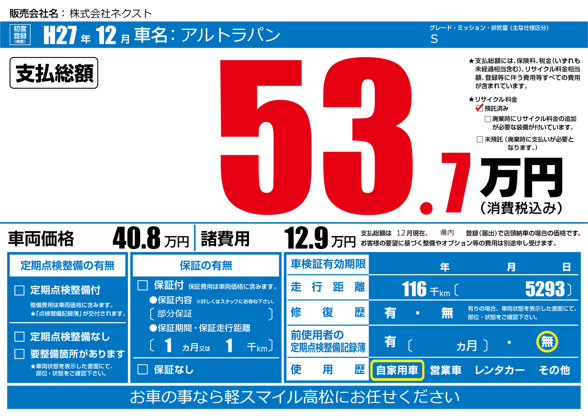 | 走行キロ | 11.6万km | 初年度登録 | H27年12月 |