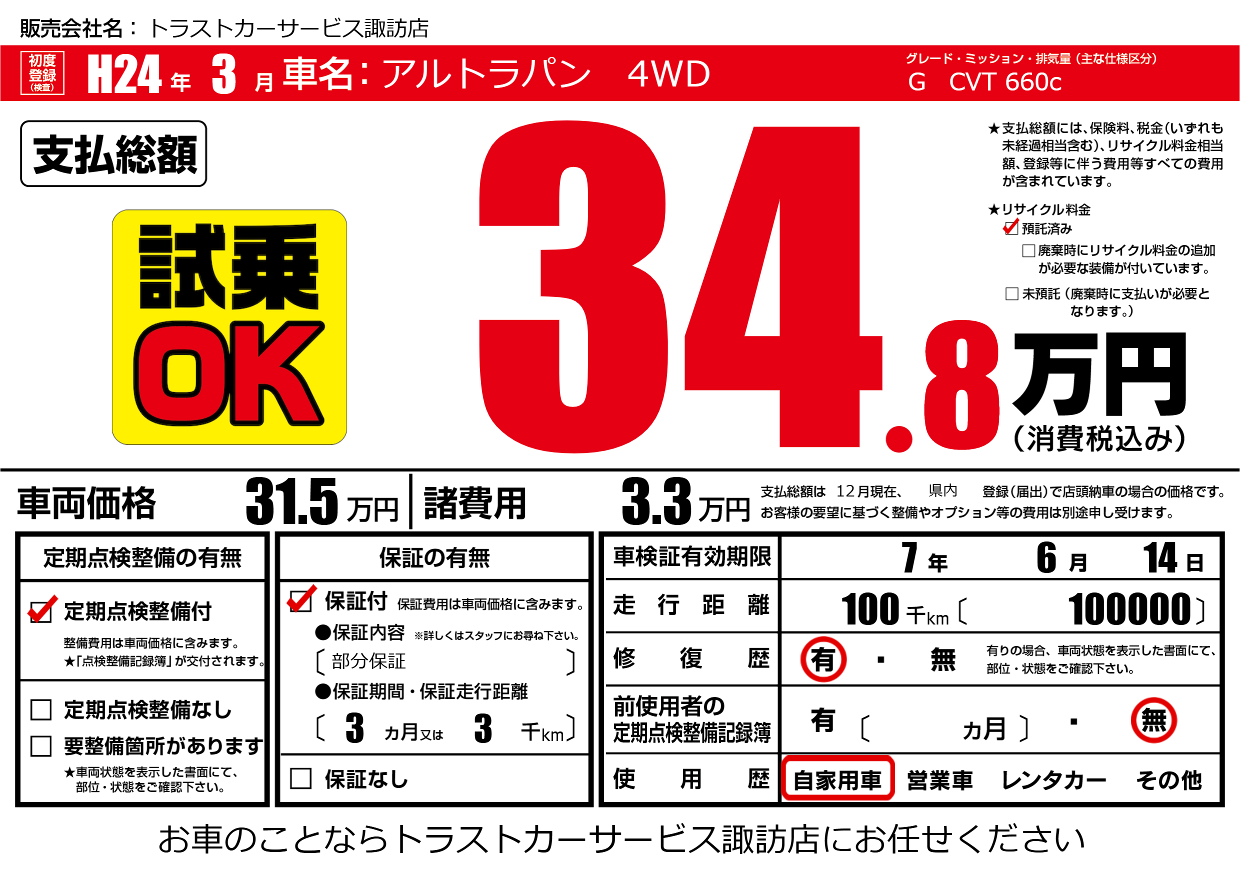 | 走行キロ | 10万km | 初年度登録 | H24年3月 |