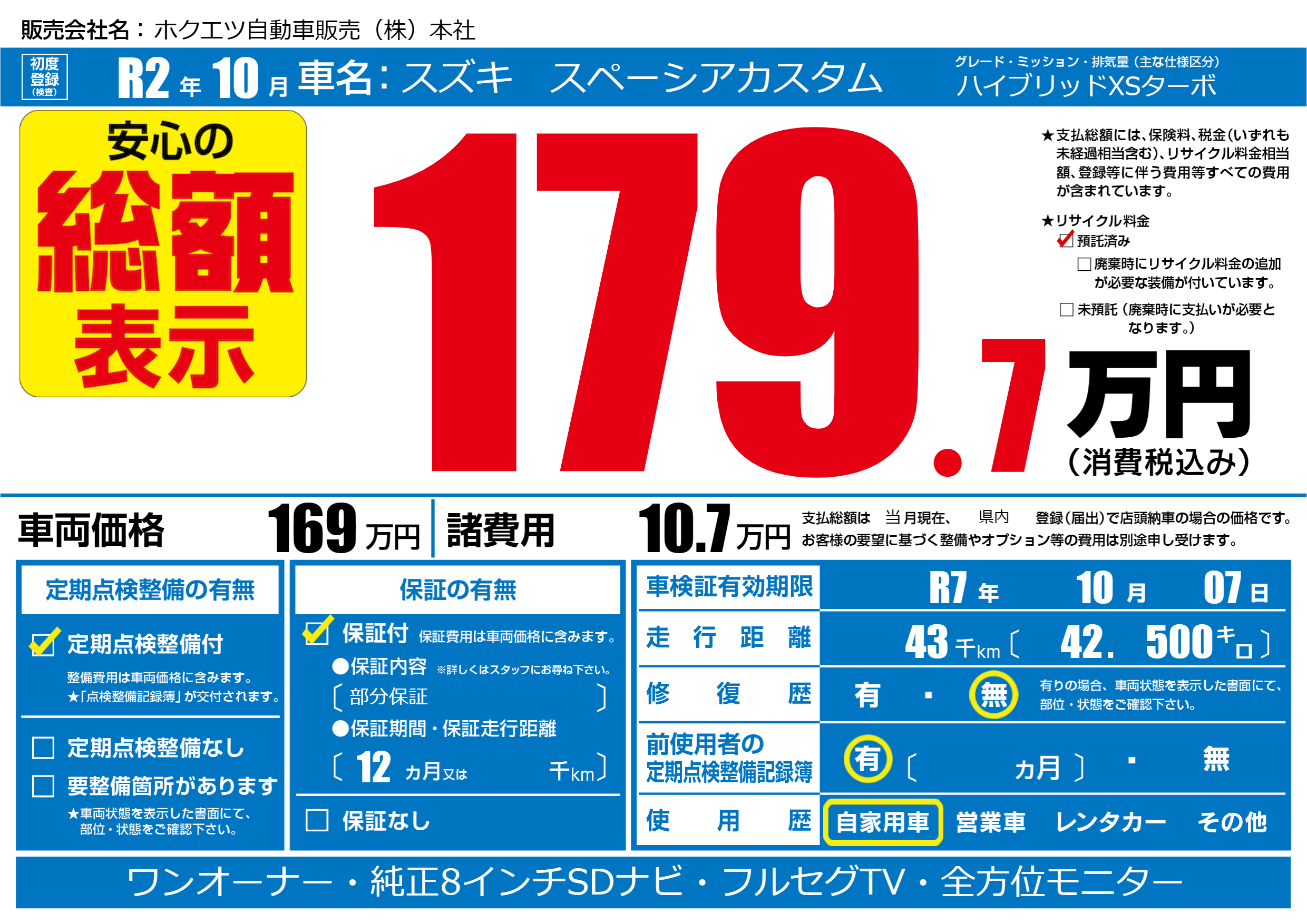 | 車名 | スズキ スペーシアカスタム | グレード ミッション 排気量 |