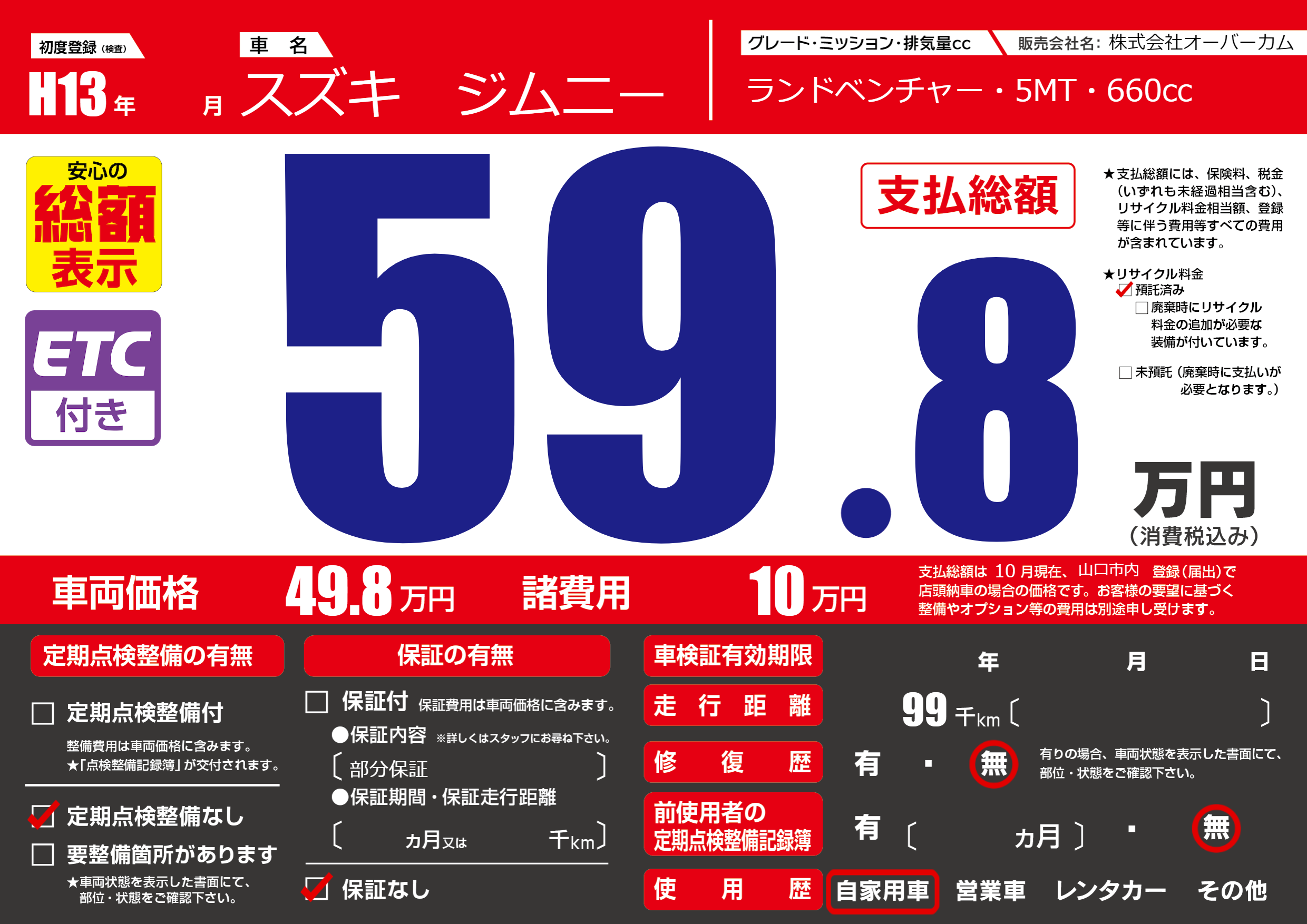 | 車名 | スズキ ジムニー | グレード ミッション 排気量 |