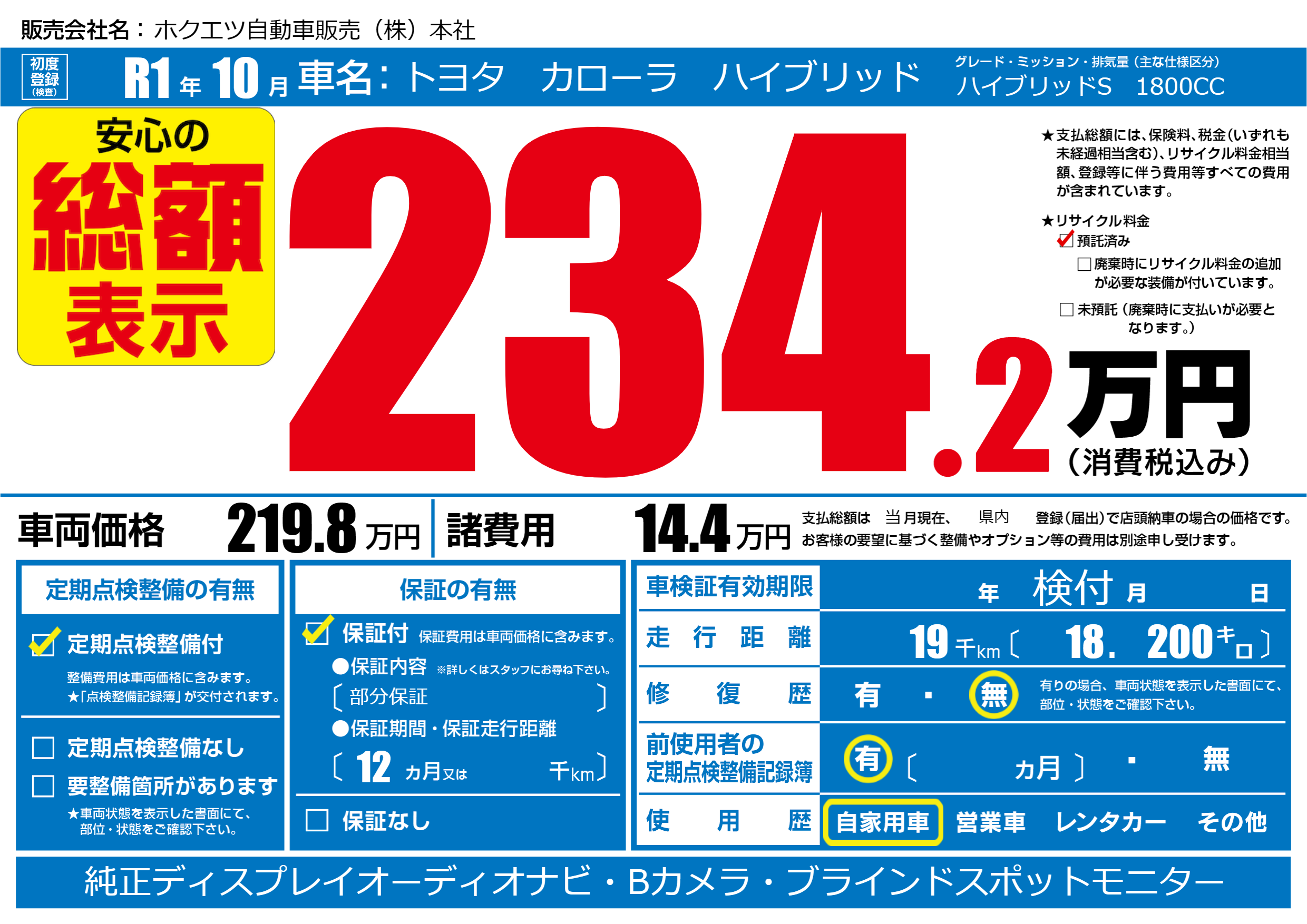 | 車名 | トヨタ カローラ ハイブリッド | グレード ミッション 排気量 |