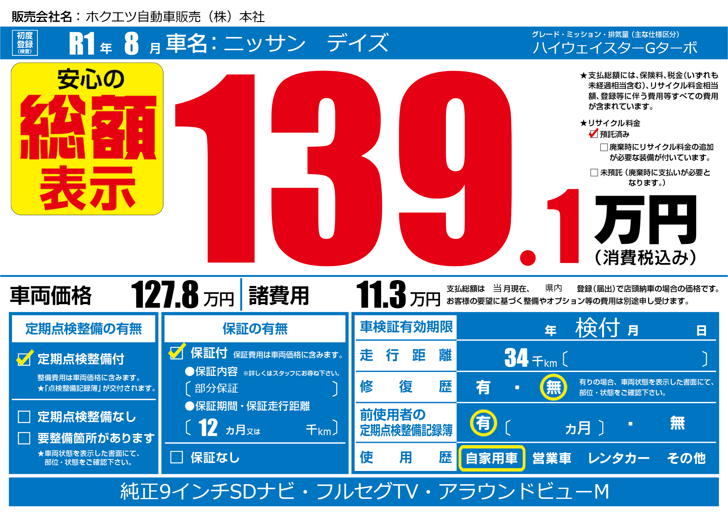 | 車名 | ニッサン デイズ | グレード ミッション 排気量 |