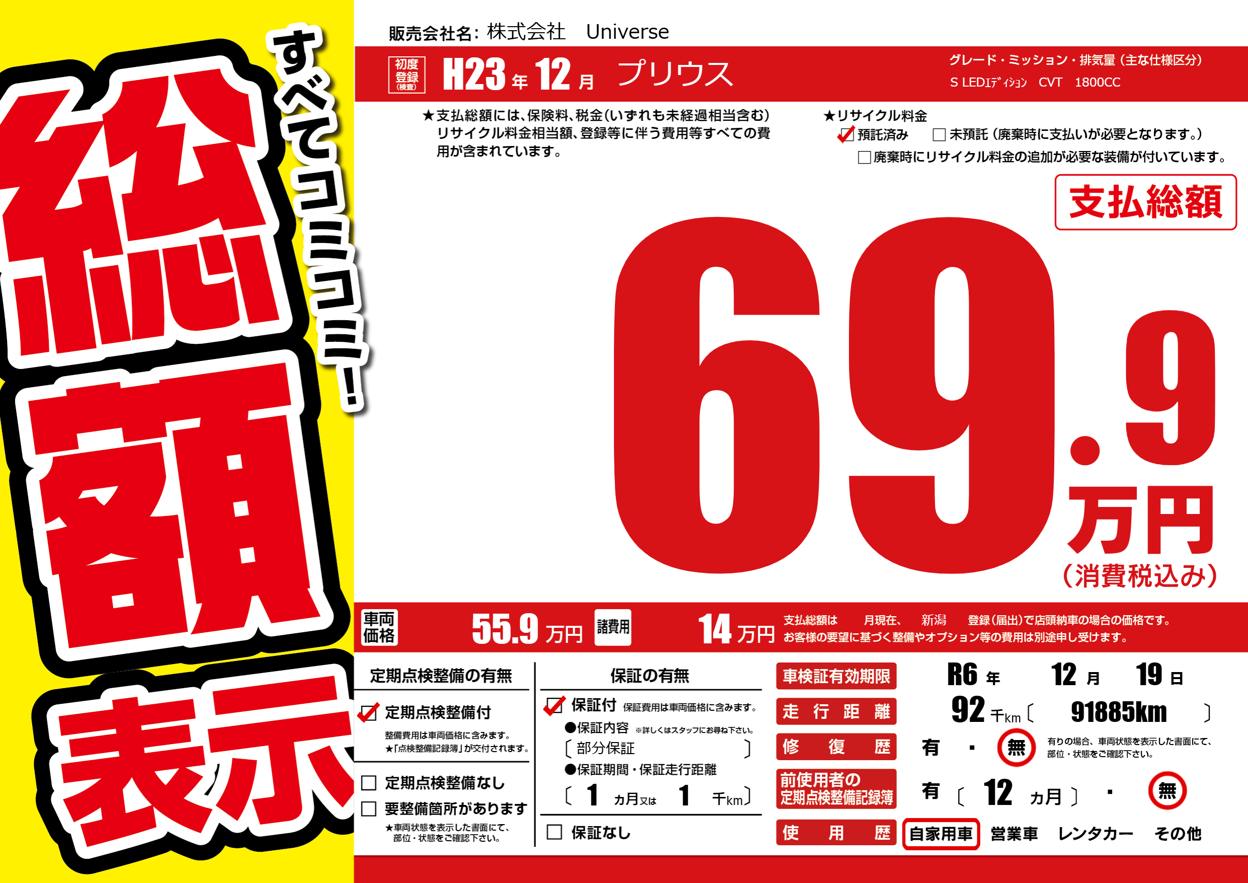 | 車名 | プリウス | グレード ミッション 排気量 |
