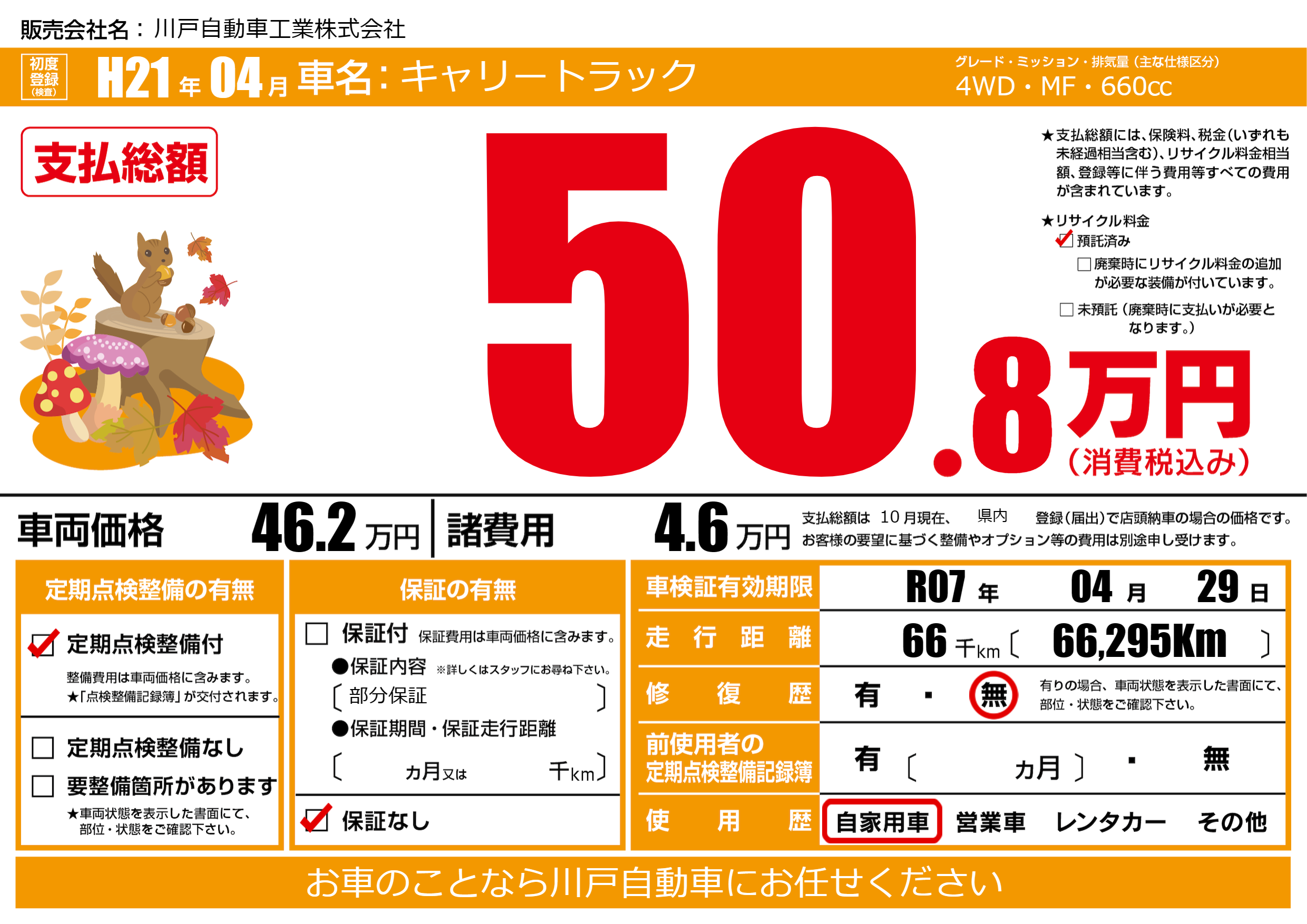 | 車名 | キャリートラック | グレード ミッション 排気量 |