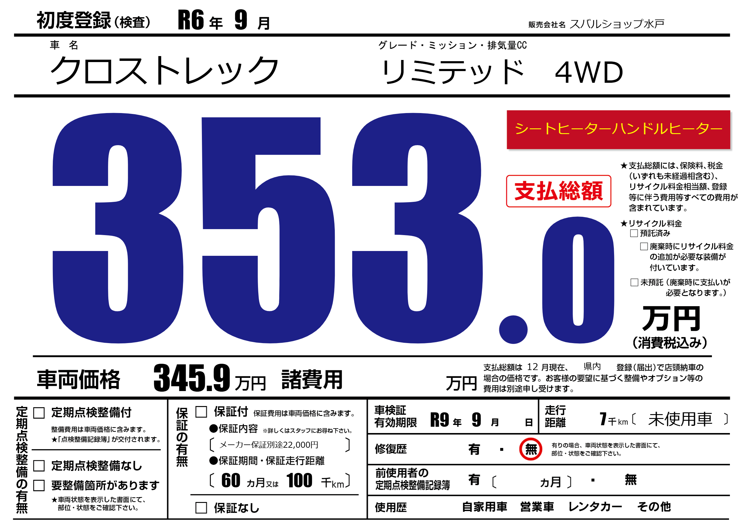 | 走行キロ | 0.7万km | 初年度登録 | R6年9月 |