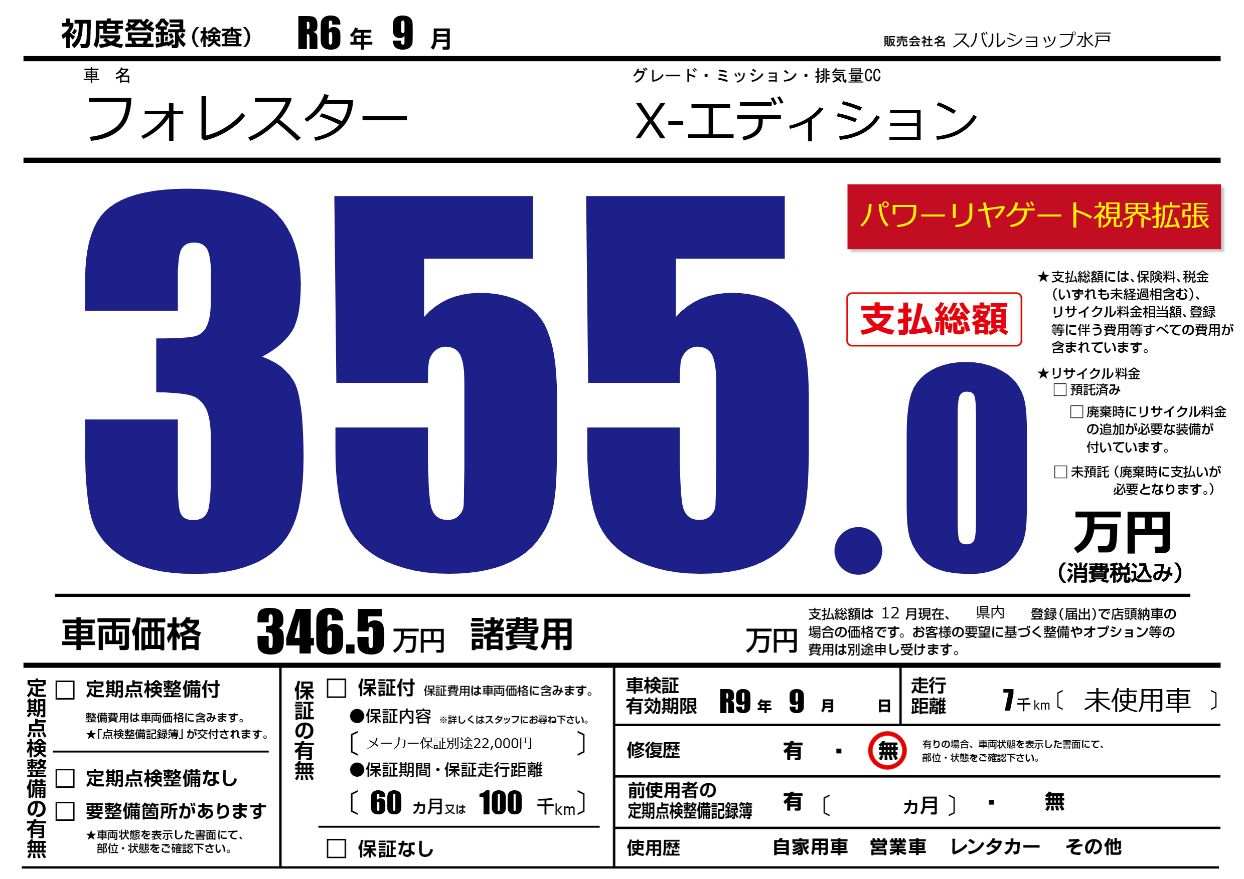 | 車名 | フォレスター | グレード ミッション 排気量 |