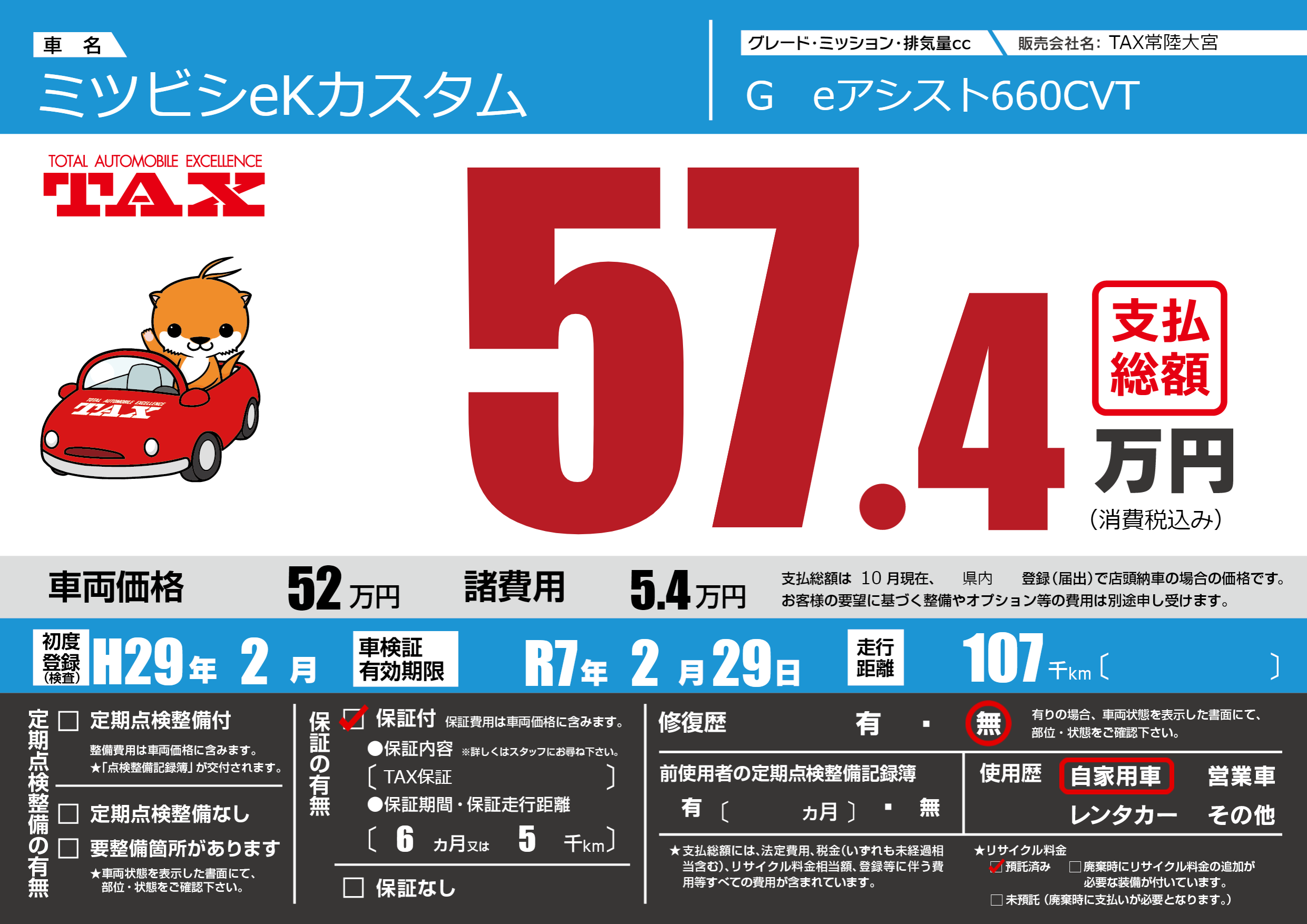 保証付き 保証内容(TAX保証) 6ヶ月または(5)千kmまで |