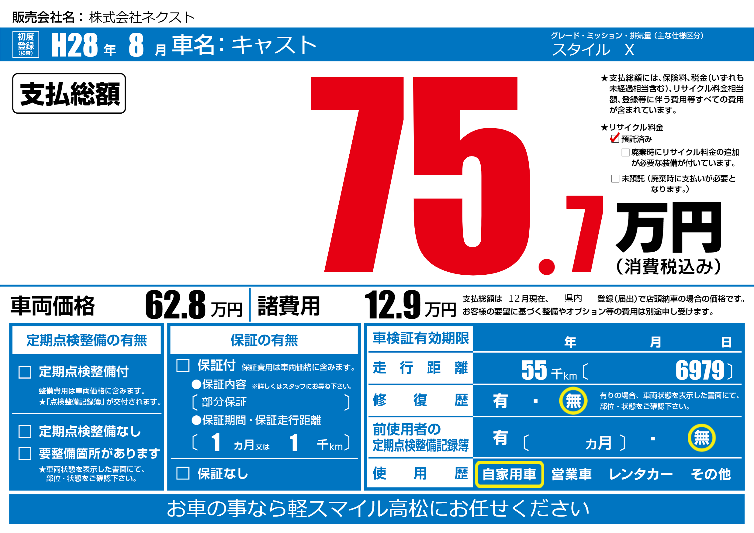 | 走行キロ | 5.5万km | 初年度登録 | H28年8月 |