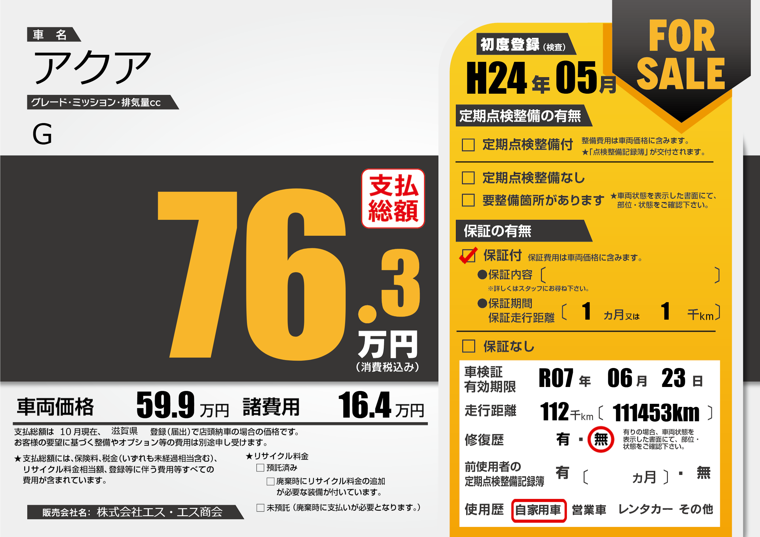| 走行キロ | 11.2万km | 初年度登録 | H24年05月 |