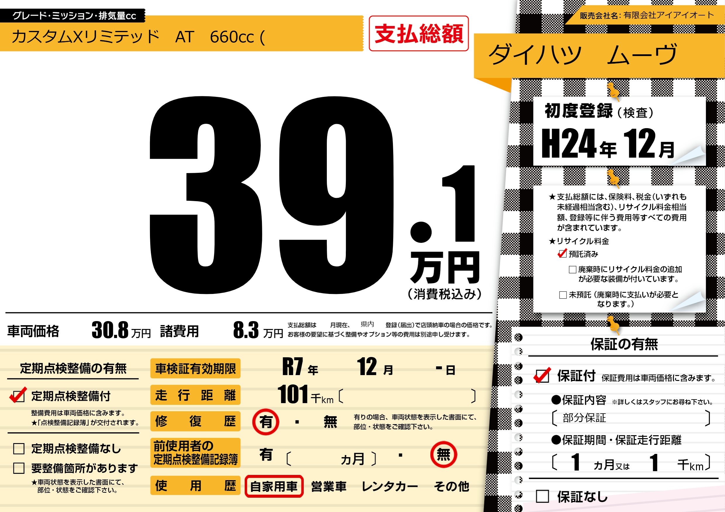 | 走行キロ | 10.1万km | 初年度登録 | H24年12月 |