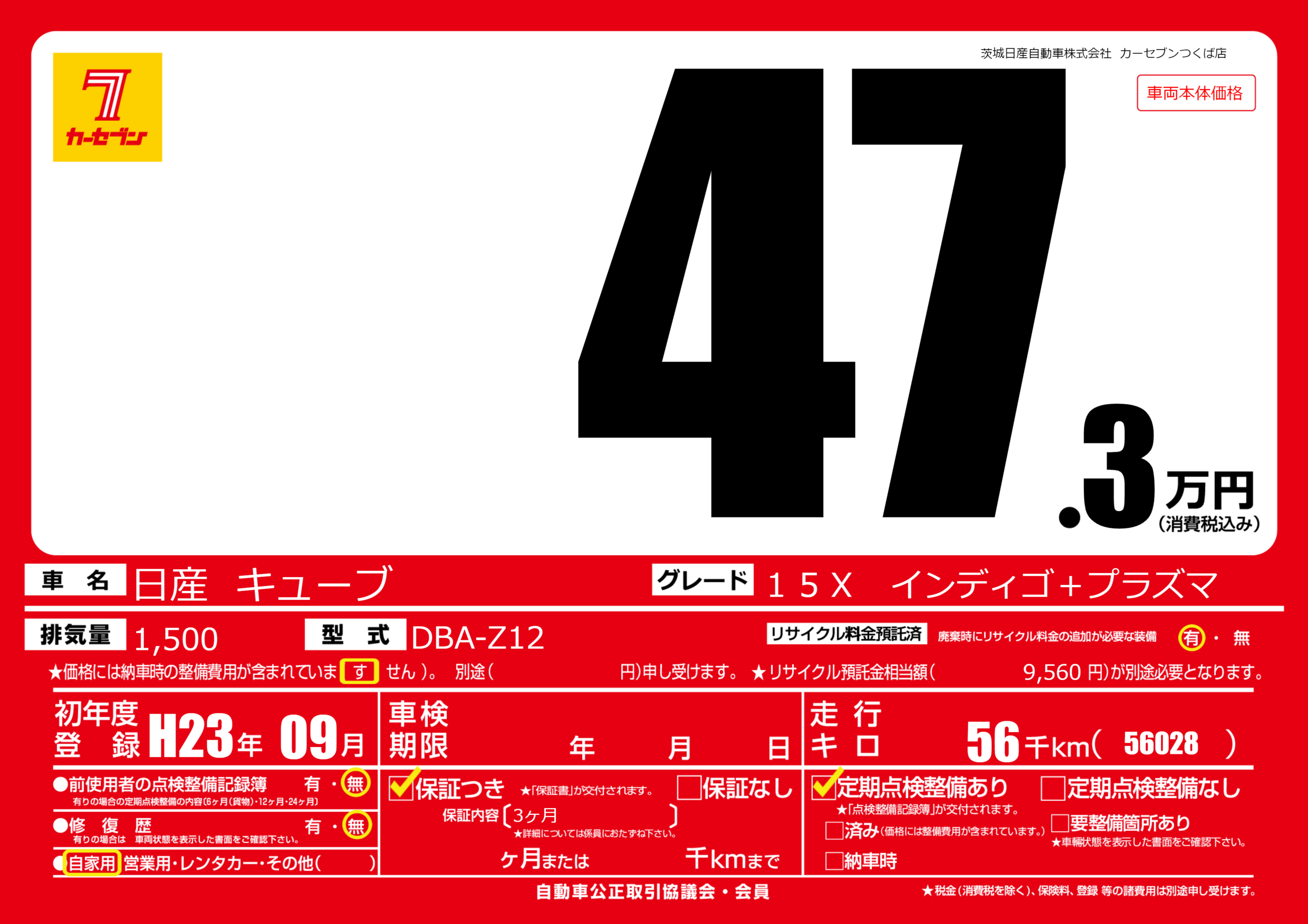 | 車名 | 日産 キューブ | グレード ミッション 排気量 |