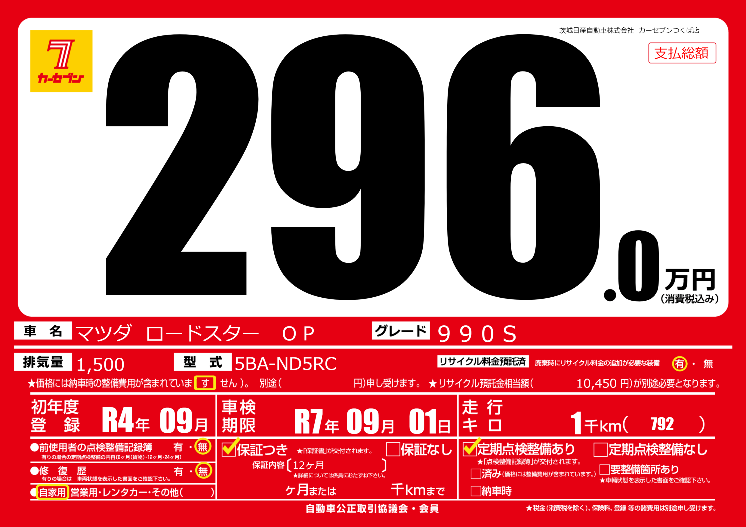 | 車名 | マツダ ロードスター OP | グレード ミッション 排気量 |