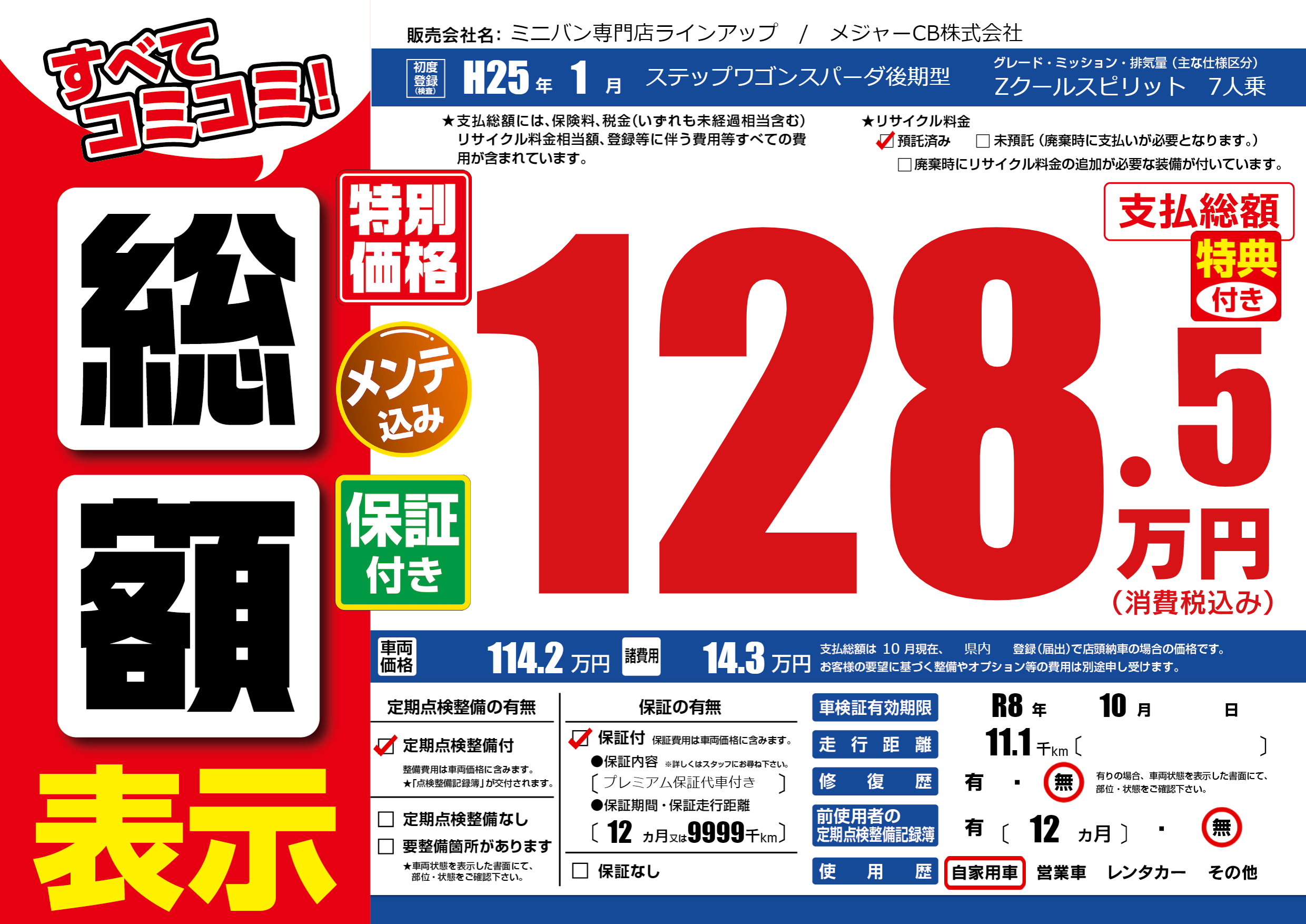 保証付き 保証内容(プレミアム保証代車付き) 12ヶ月または(9999)千kmまで |