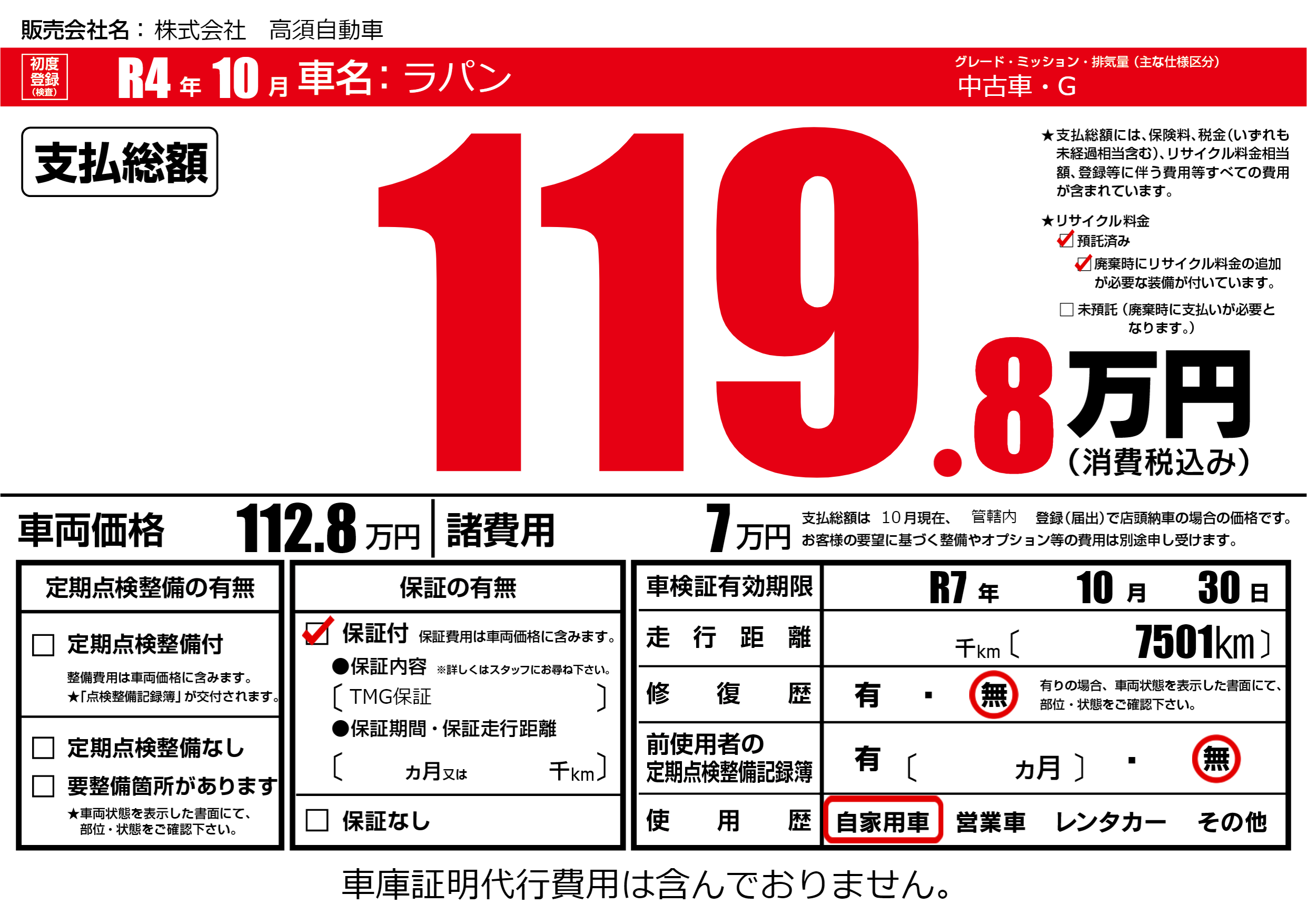 | 車名 | ラパン | グレード ミッション 排気量 |