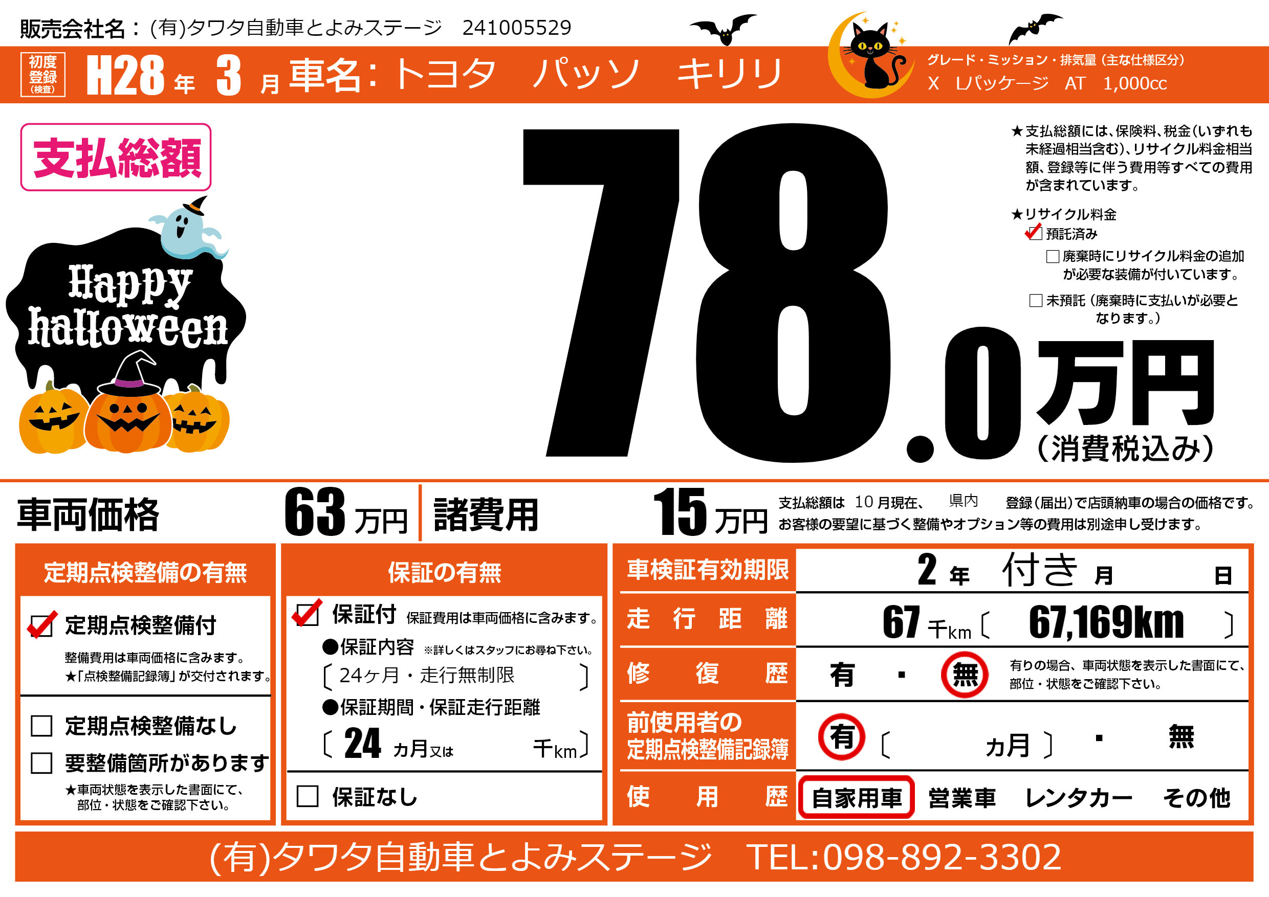 | 走行キロ | 6.7万km | 初年度登録 | H28年3月 |