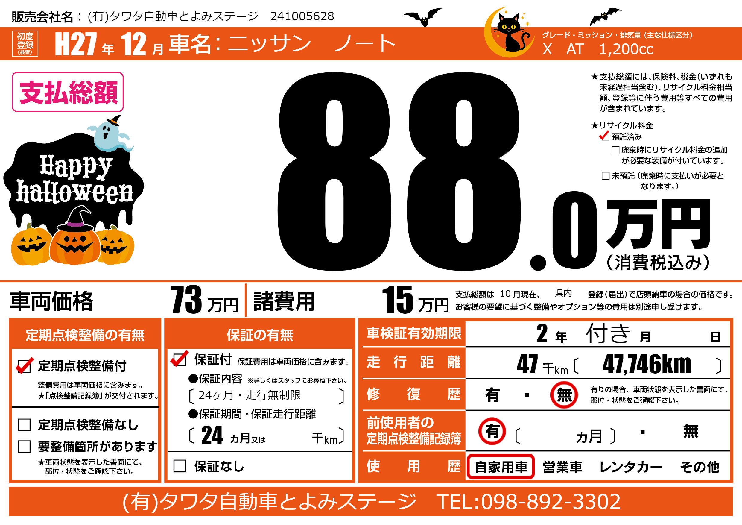 | 走行キロ | 4.7万km | 初年度登録 | H27年12月 |