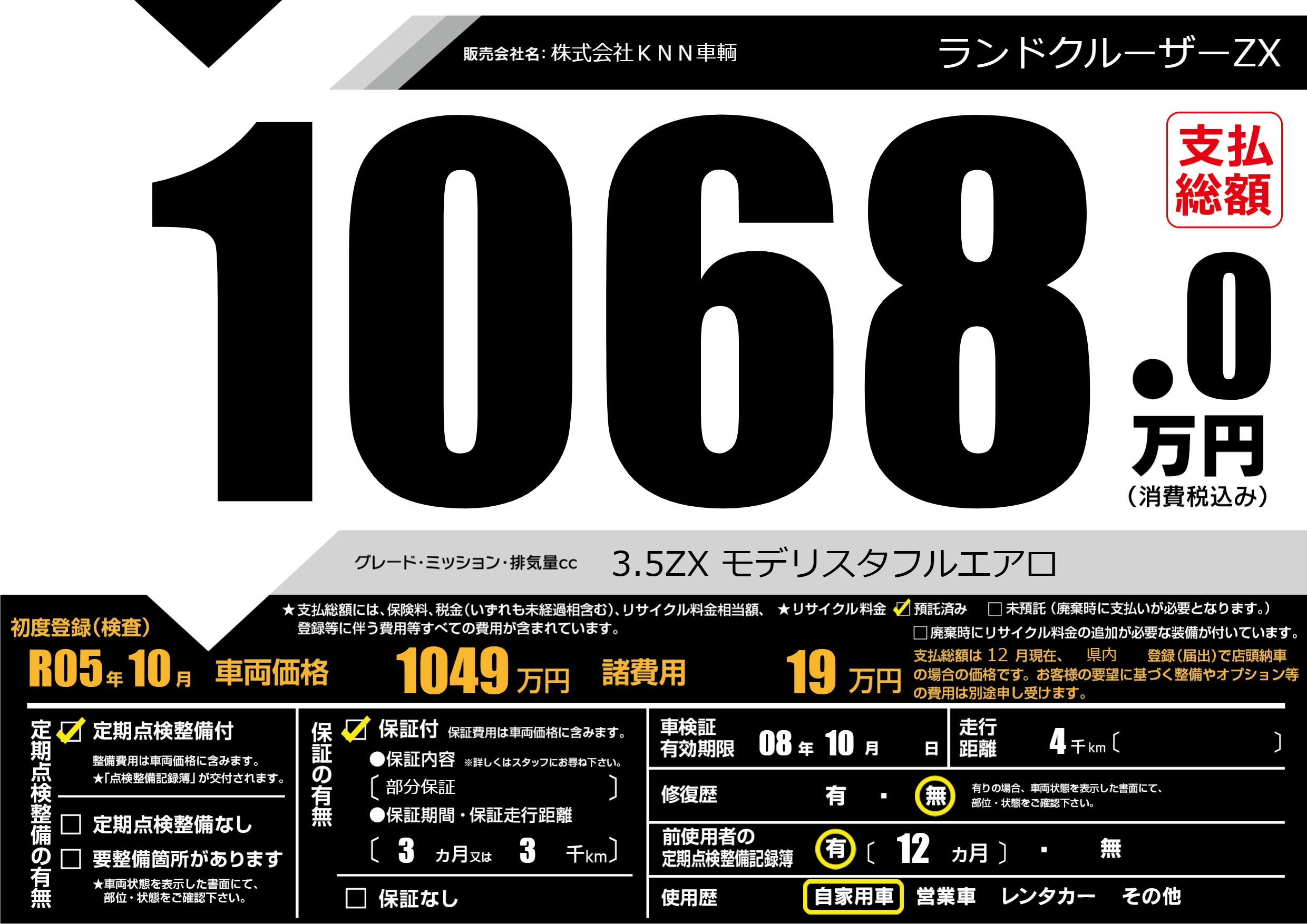 | 車名 | ランドクルーザーZX | グレード ミッション 排気量 |