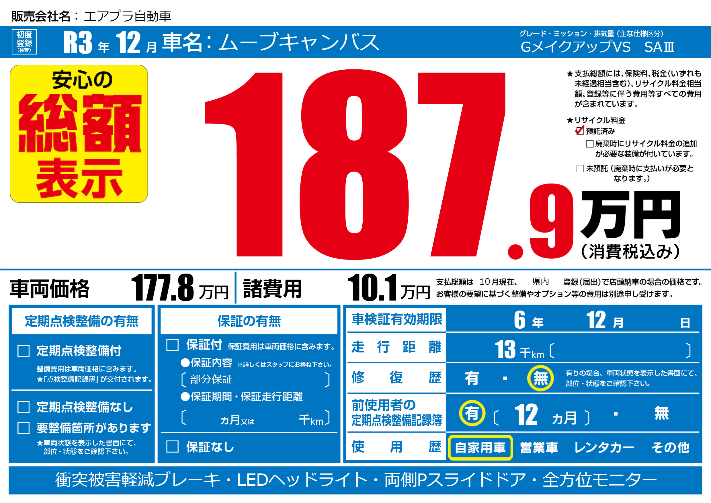 | 走行キロ | 1.3万km | 初年度登録 | R3年12月 |