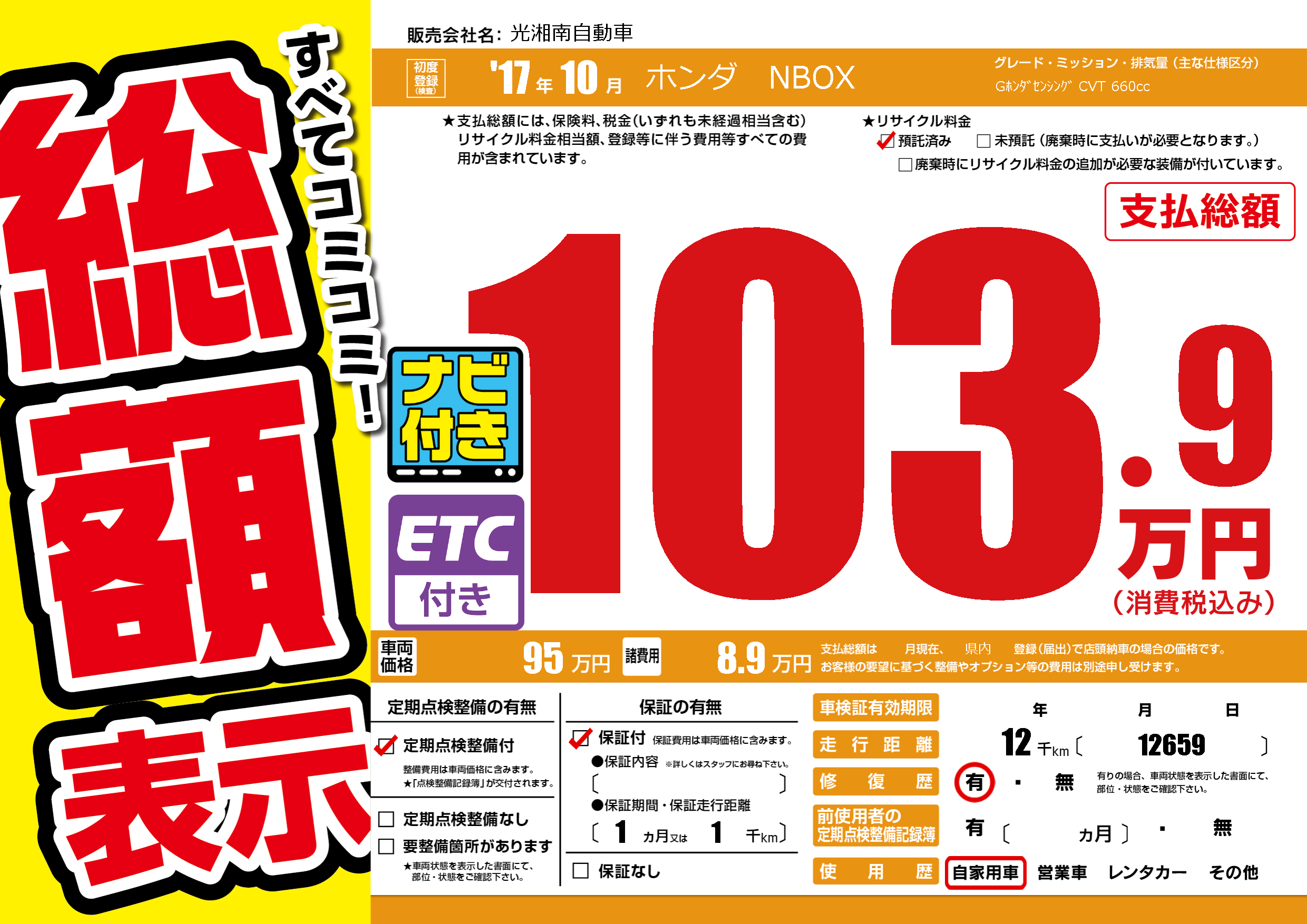 | 車名 | ホンダ NBOX | グレード ミッション 排気量 |