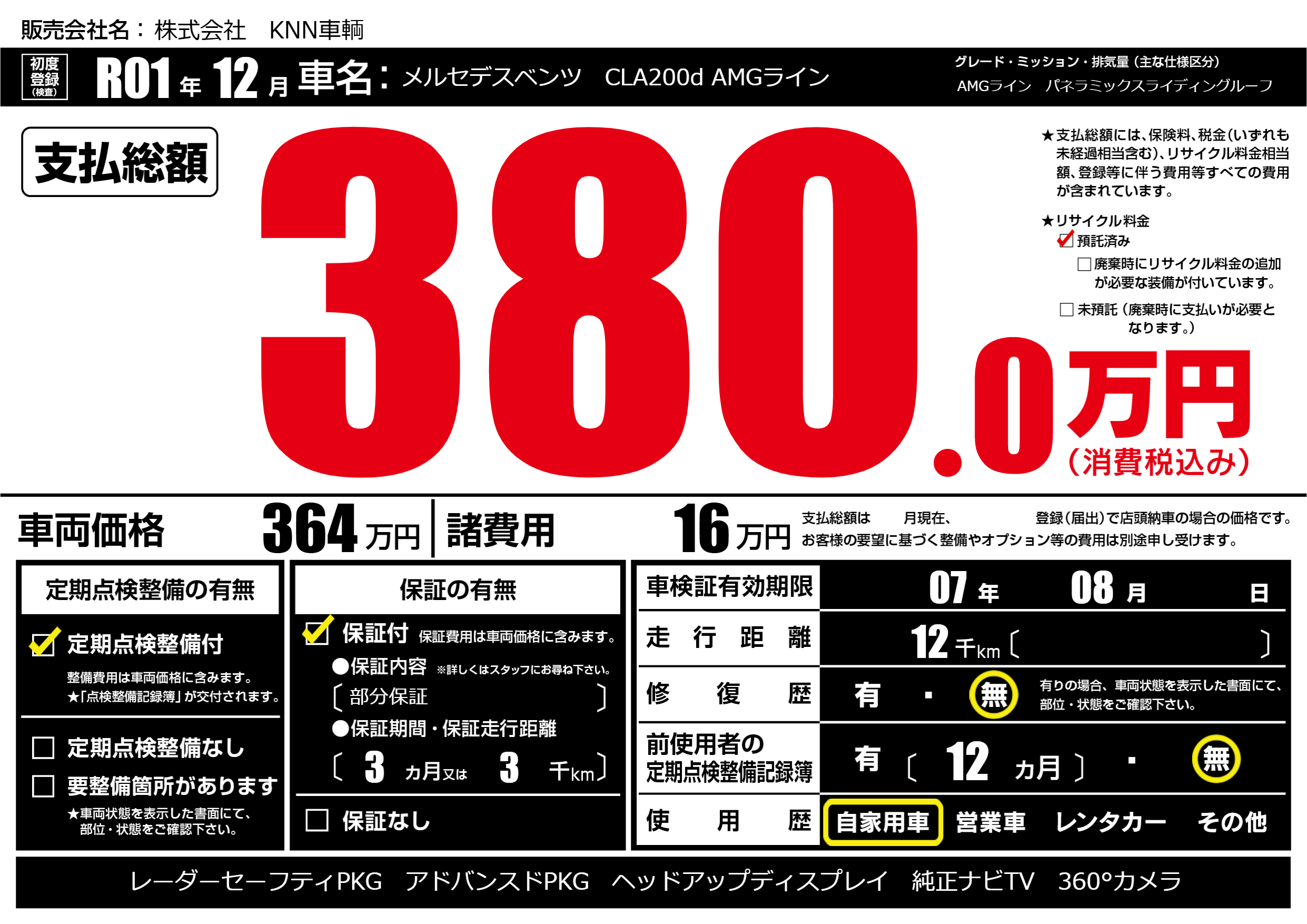 | 車名 | メルセデスベンツ CLA200d AMGライン | グレード ミッション 排気量 |
