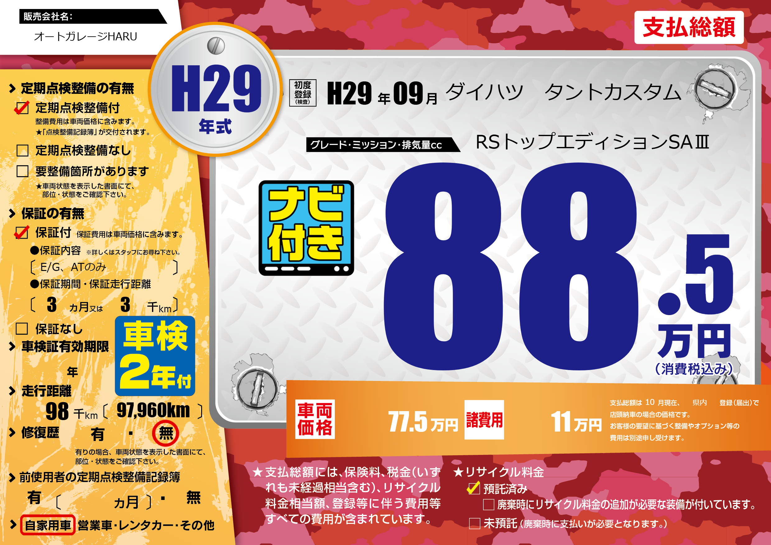 | 車名 | ダイハツ タントカスタム | グレード ミッション 排気量 |